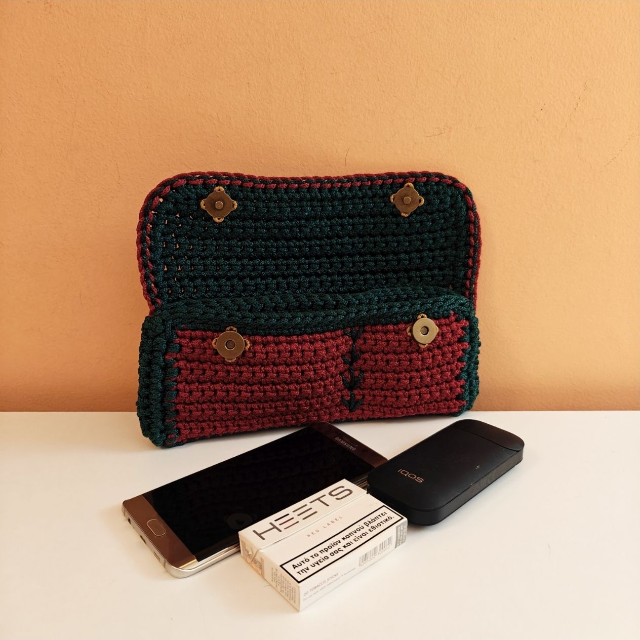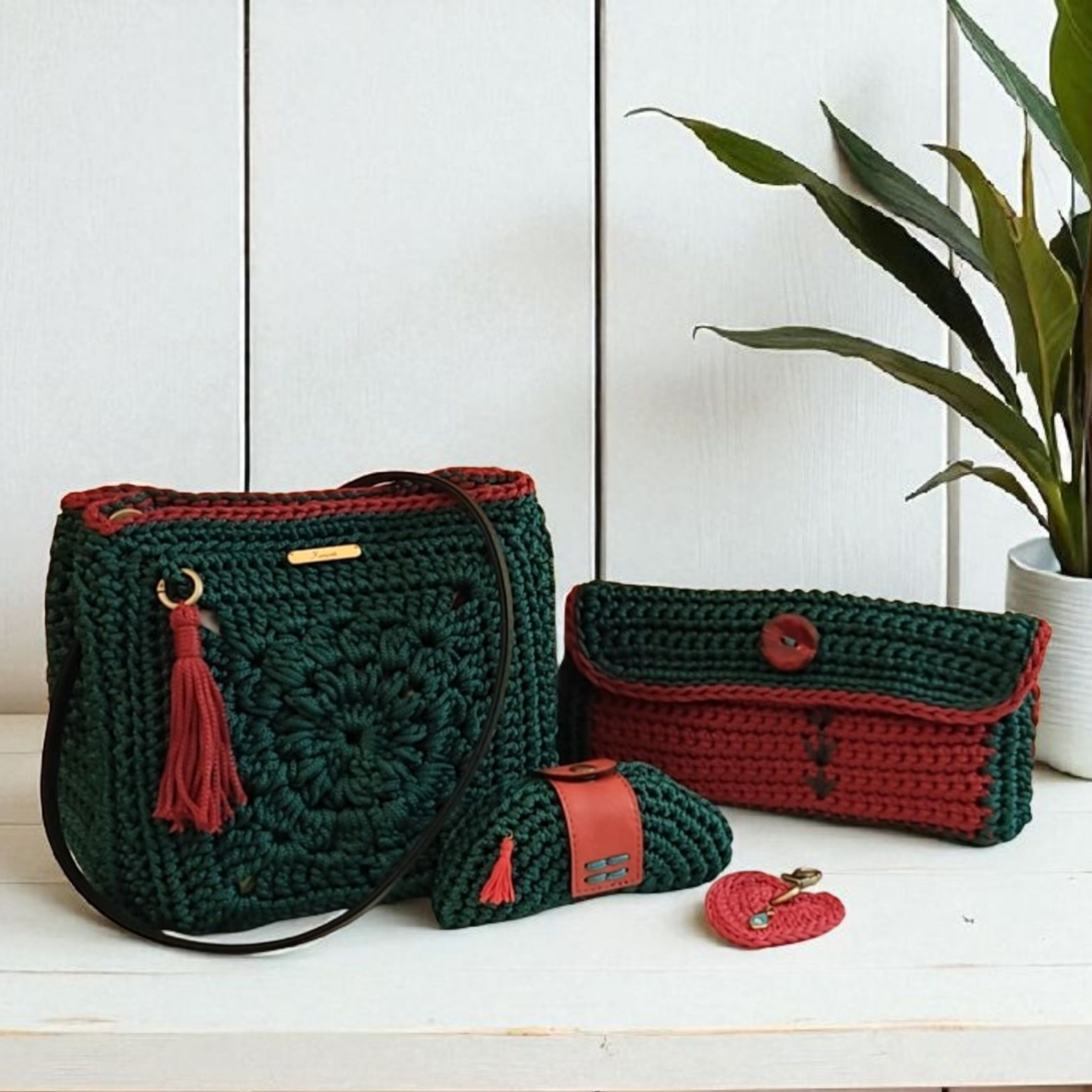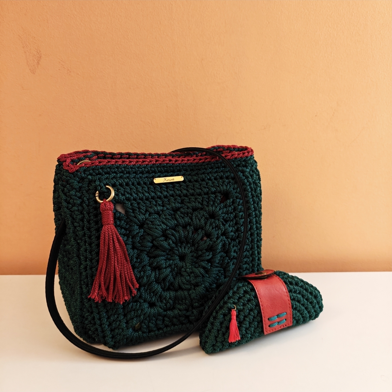 Χειροποίητο πλεκτό σετ τσαντάκι - νεσεσέρ - πορτοφολάκι πράσινο κυπαρρισί-κόκκινο