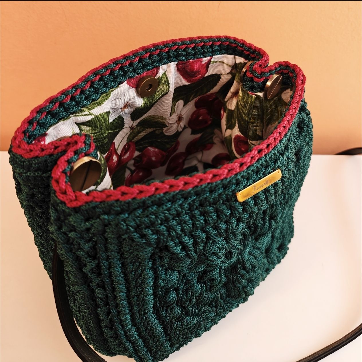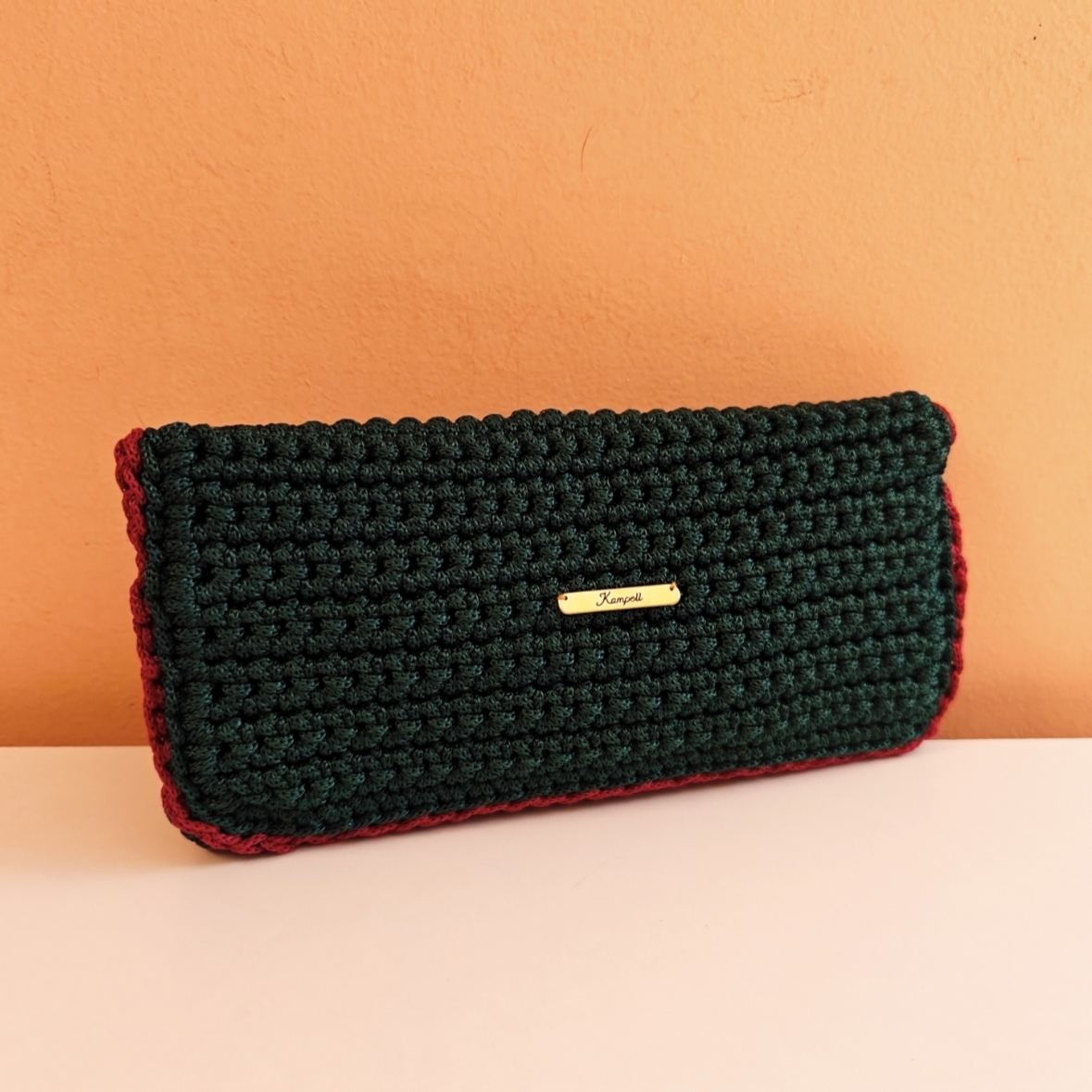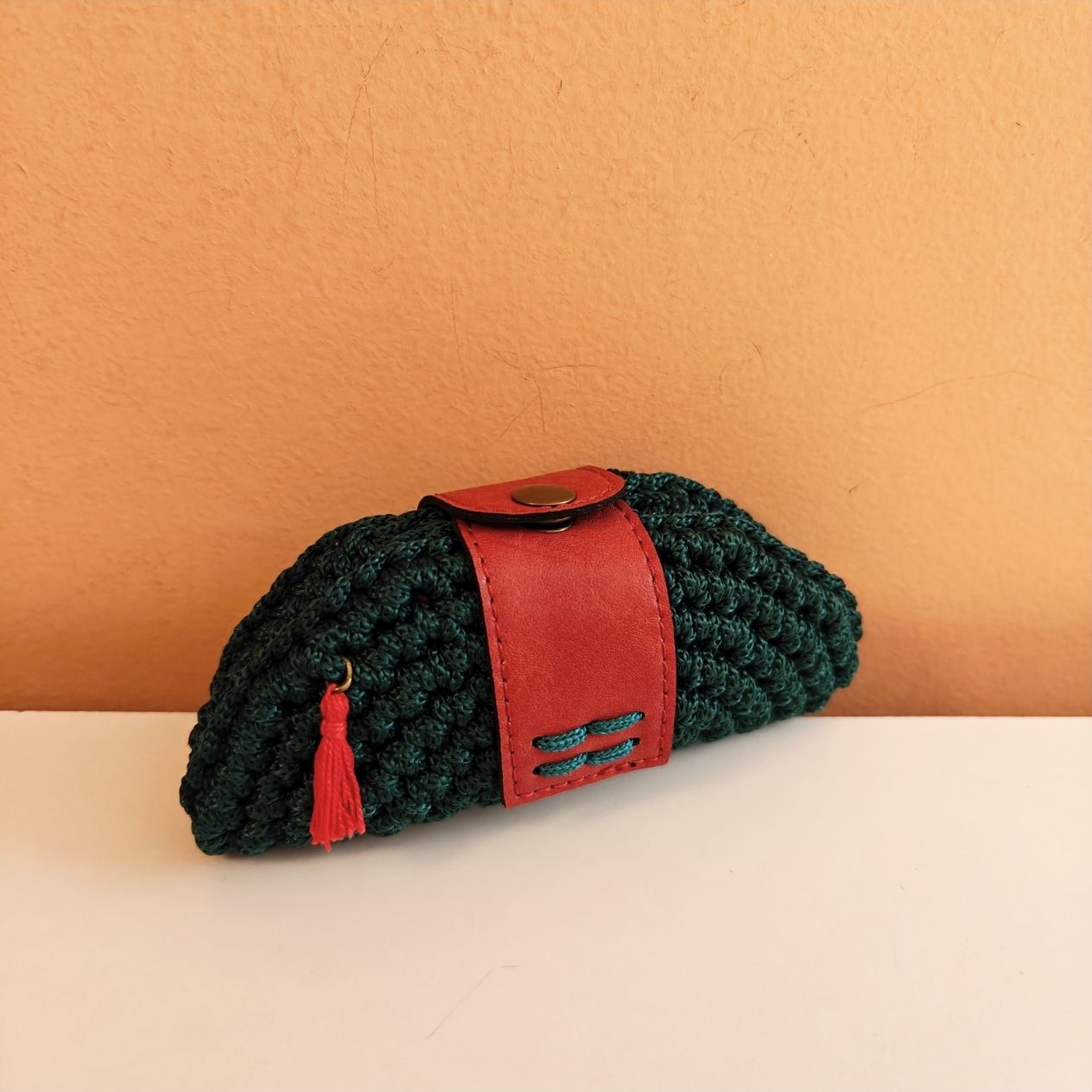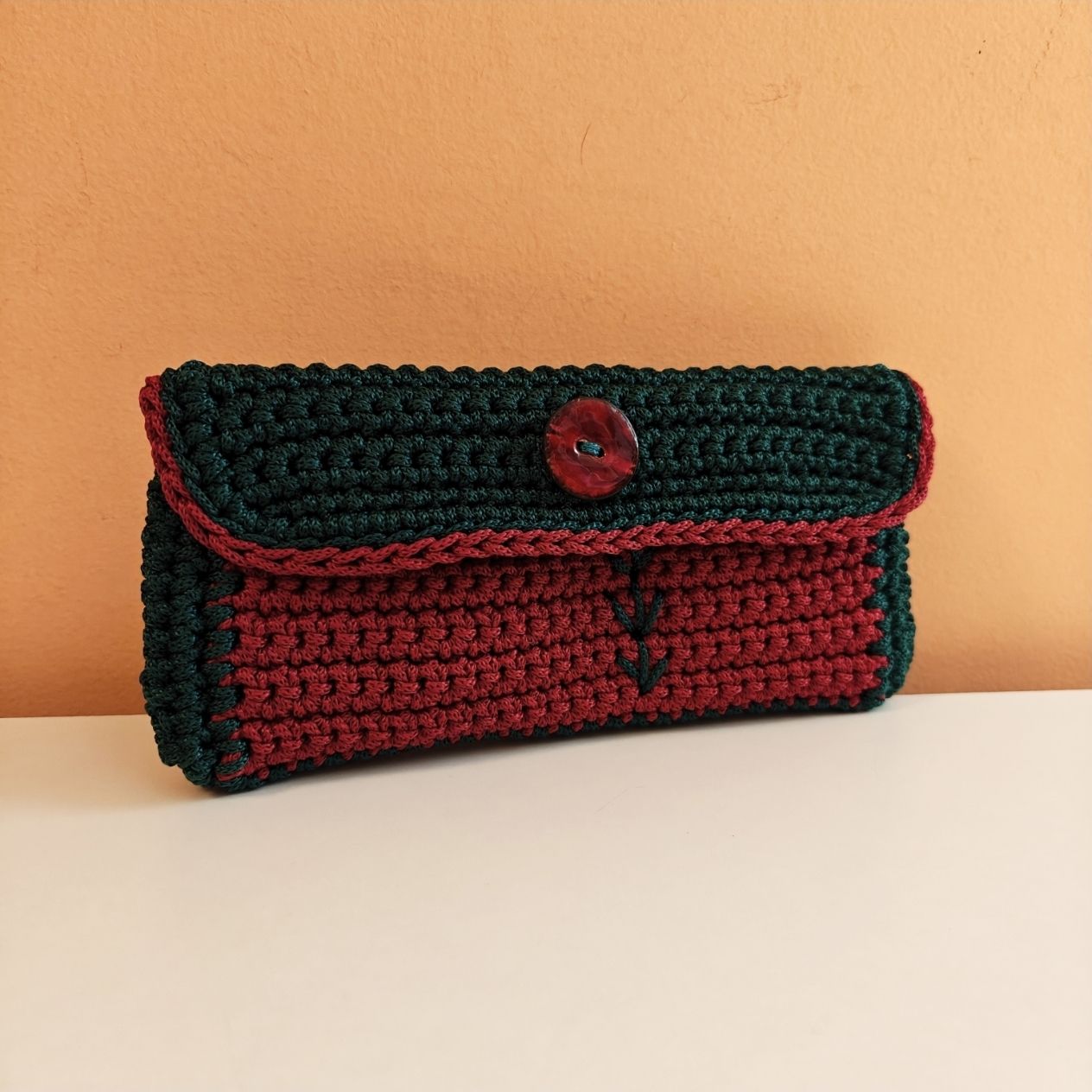 Χειροποίητο πλεκτό σετ τσαντάκι - νεσεσέρ - πορτοφολάκι πράσινο κυπαρρισί-κόκκινο