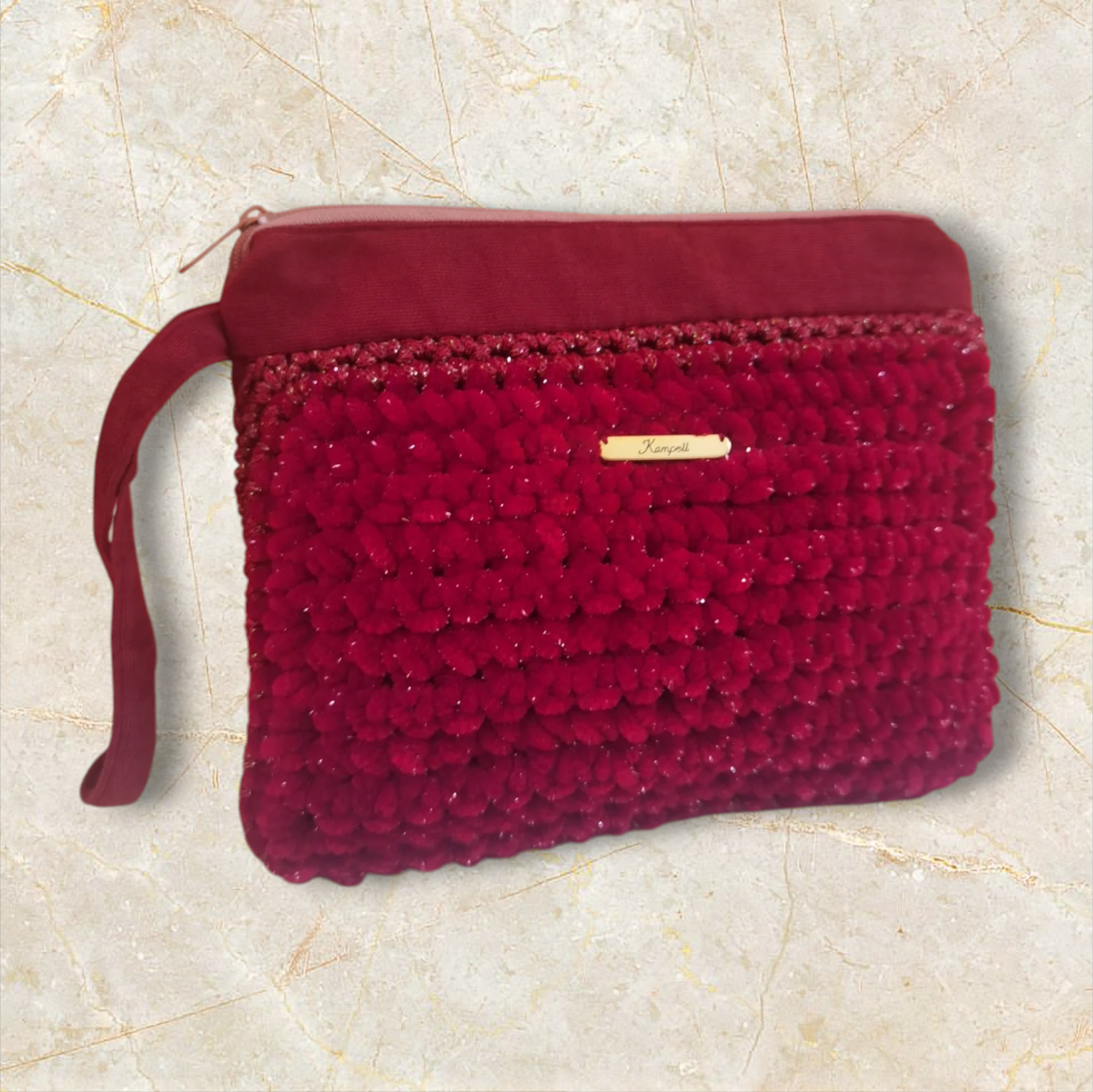 Χειροποίητο πλεκτό τσαντάκι καρπού μπορντώ μεταλλιζέ