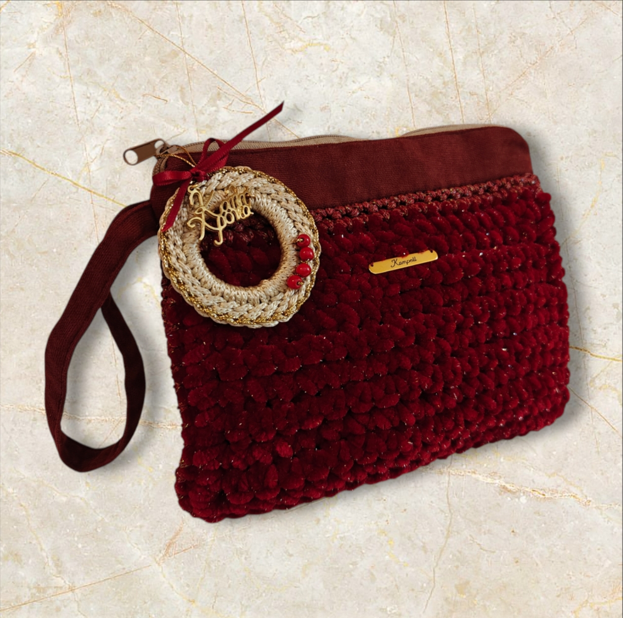 Χειροποίητο πλεκτό τσαντάκι καρπού μπορντώ μεταλλιζέ