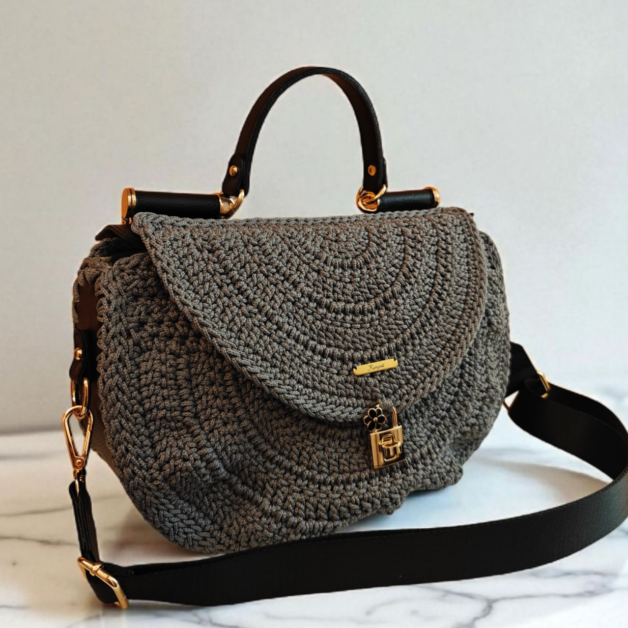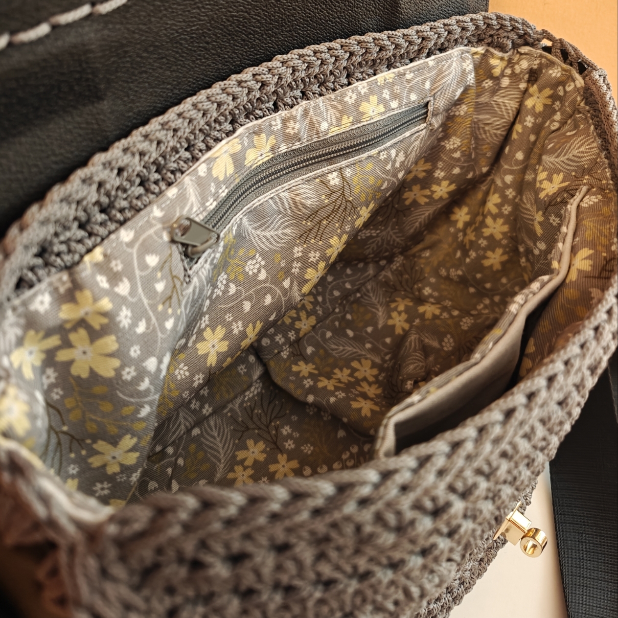 Χρώμα : γκρι Καπάκι: πλεκτό, γκρι Εσωτερικά : φόδρα, γκρι Κλείσιμο : δερμάτινο eco χεράκι, μαύρο Πάτος: περιμετρικός, δέρμα eco μαύρο Χεράκι: ρυθμιζόμενος ιμάντας, μαύρος