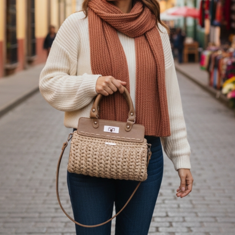 Χρώμα : εκρού Κλείσιμο : δερμάτινη φάσα & μεταλλικό κούμπωμα Κράτημα: χεράκια καρπούΛουράκι : λεπτό χιαστί