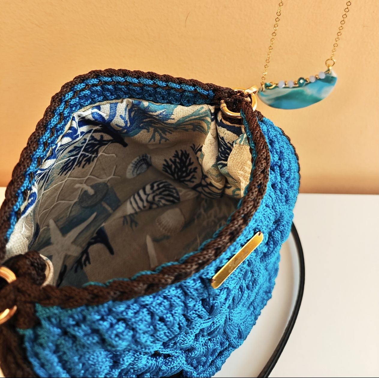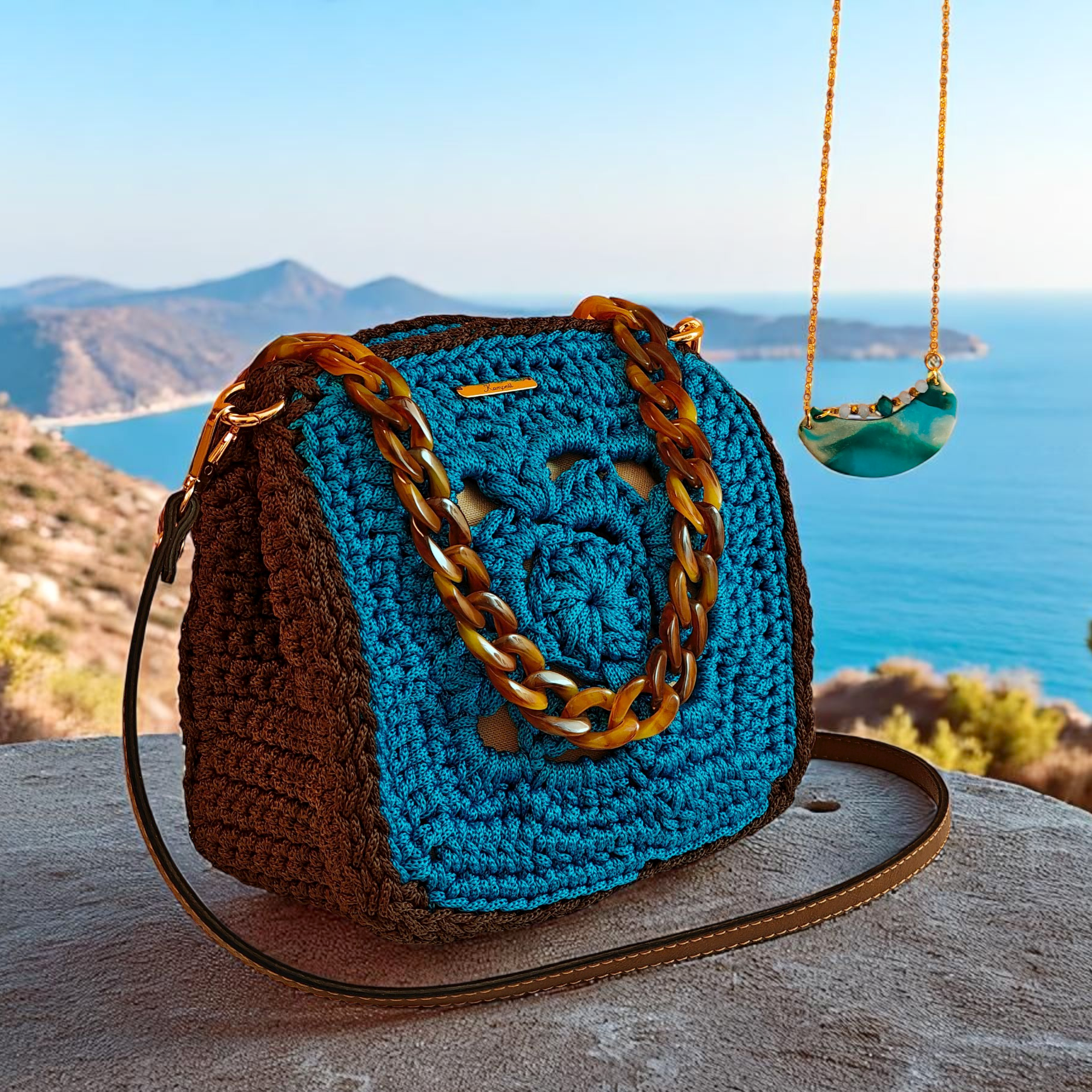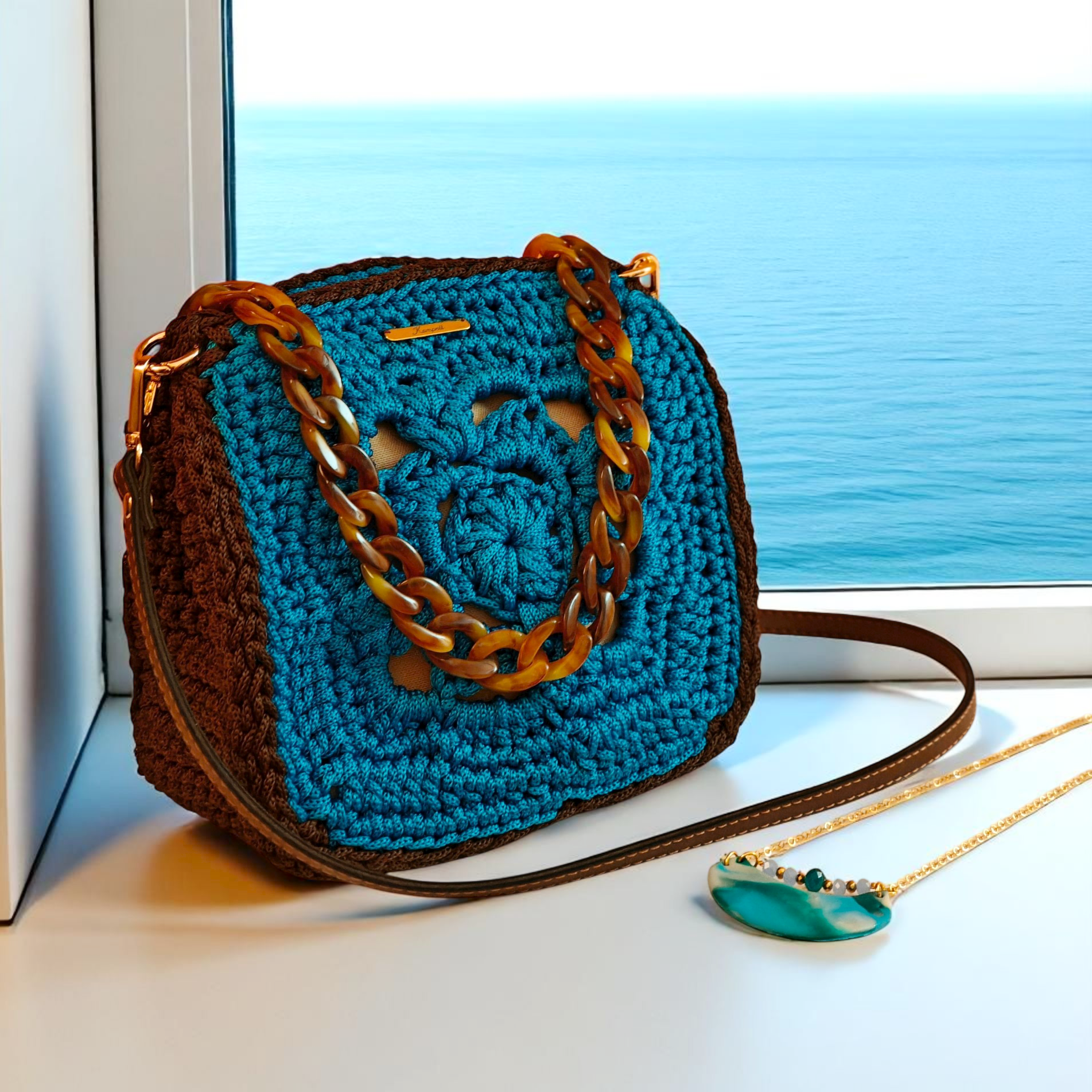 Χειροποίητο πλεκτό τσαντάκι τυρκουάζ-καφέ με λουράκι χιαστί & κοκκάλινη αλυσίδαΧρώματα : τυρκουάζ - καφέΕσωτερικά: φόδρα με αστερίεςΚλείσιμο : μαγνητάκιΛουρί : δερμάτινο eco λουράκι χιαστί, καφέ & κοκκάλινη αλυσίδα