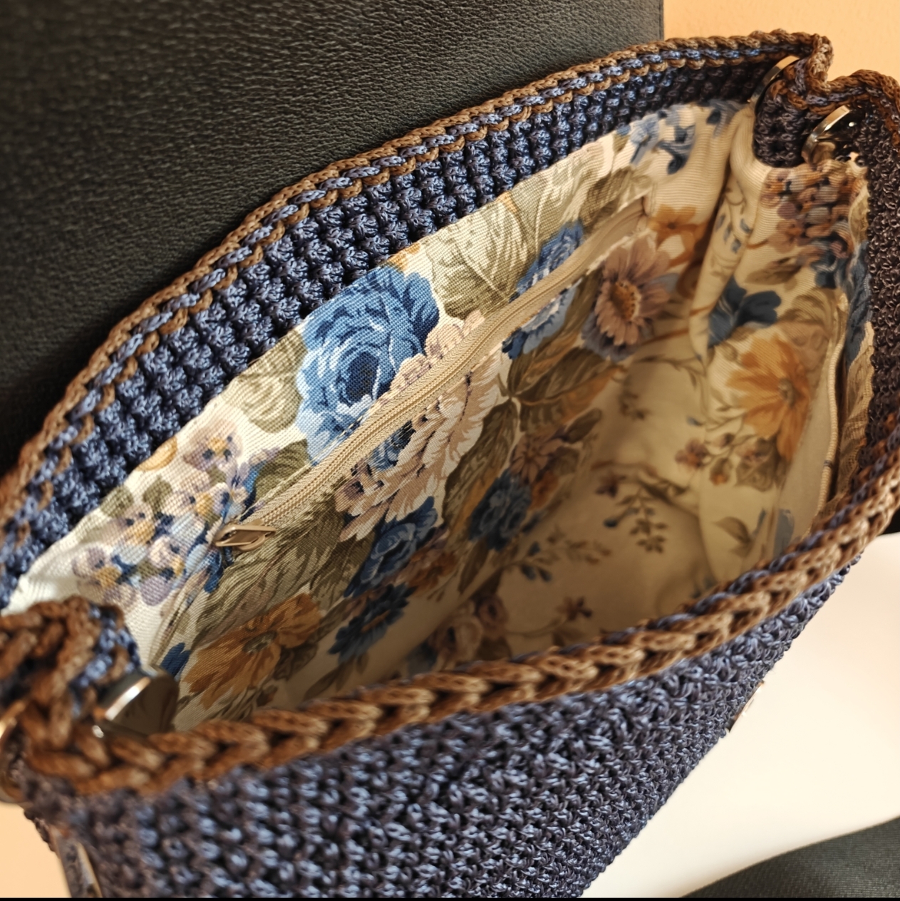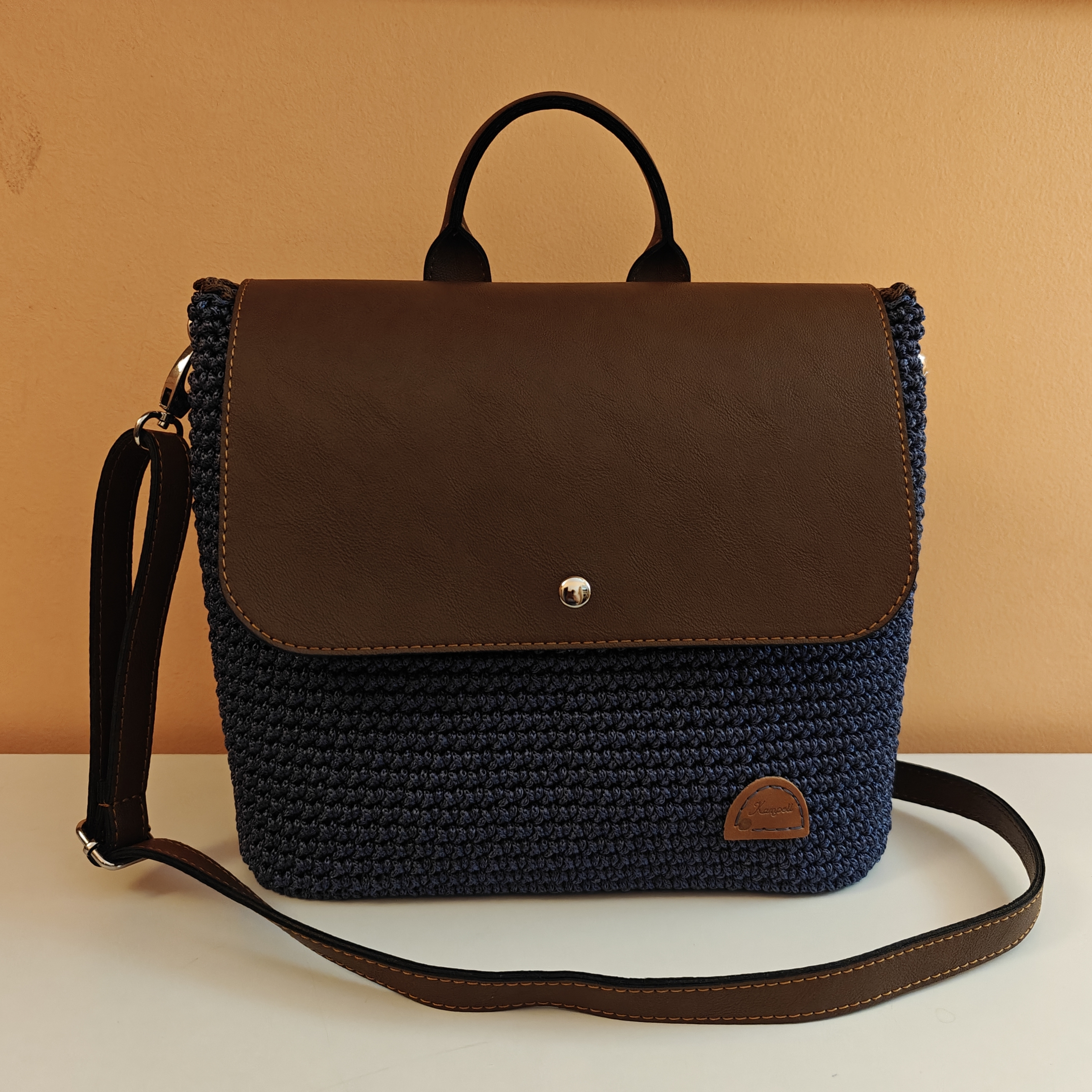 Χρώματα : μπλε - καφέΕσωτερικά : φόδρα Κλείσιμο : καπάκι καφέ δέρμα Λουράκια : 1. ώμου, καφέ δέρμα eco 2. ρυθμιζόμενος ιμάντας με σχέδιοΠάτος : ξύλινος by Qrtos Creations