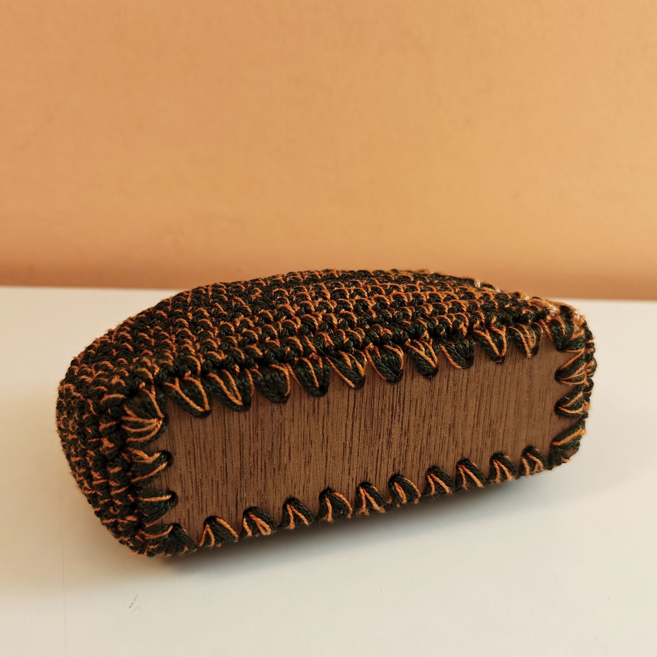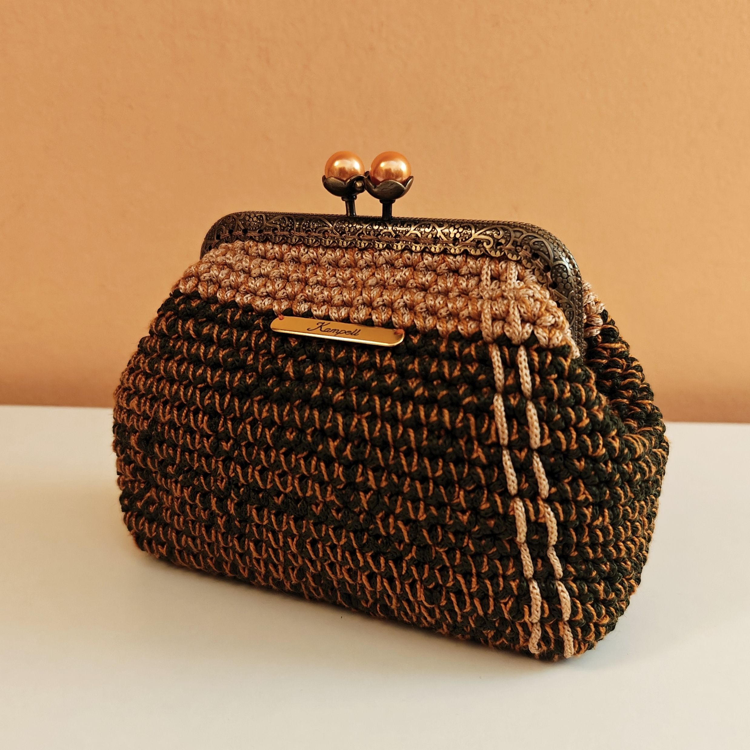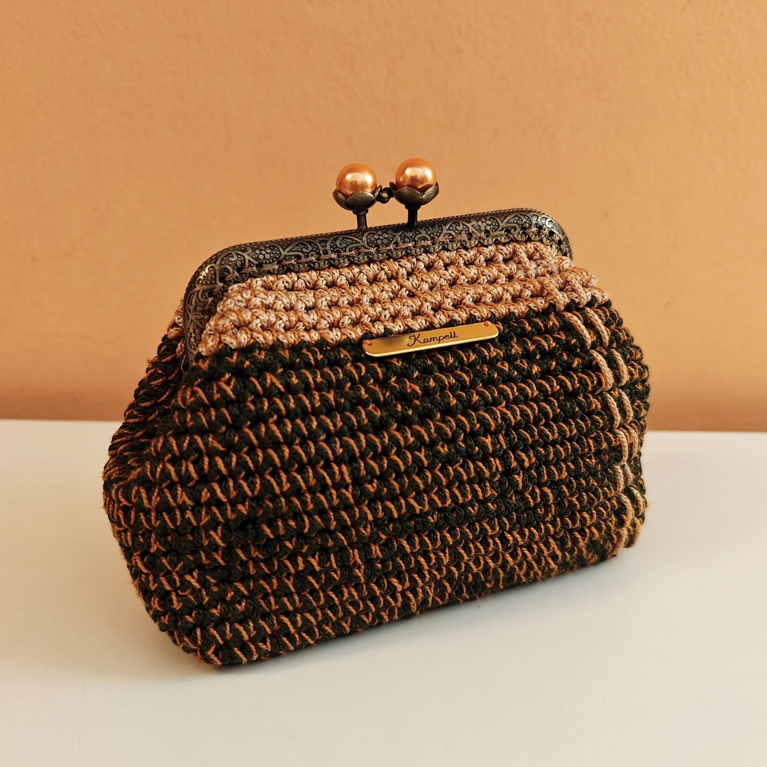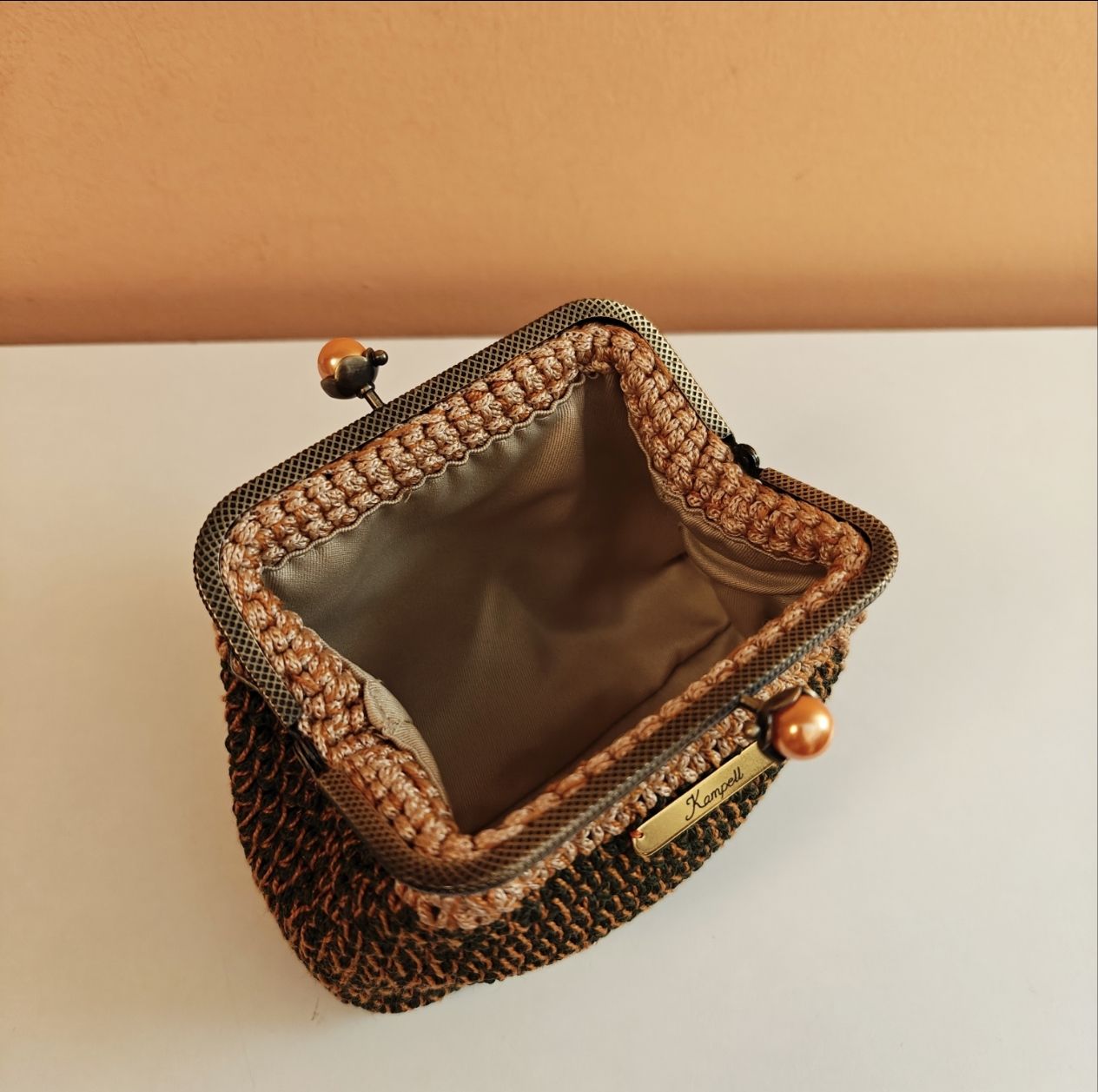 Χειροποίητο πλεκτό πορτοφολάκι με μεταλλικό πλαίσιο Εσωτερικά : φόδρα Κούμπωμα : κλικ κλακ (μπρονζέ) με σομόν περλες Πάτος : ξύλινος by Qrtos Creations