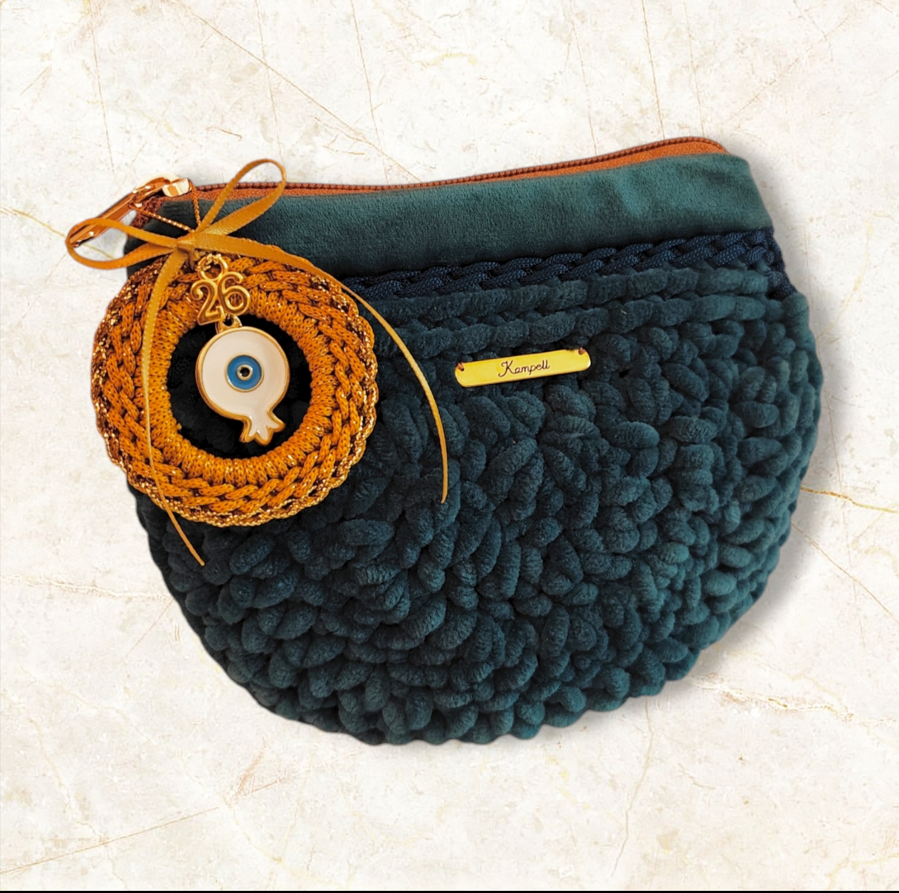 Χειροποίητο πλεκτό τσαντάκι καρπού πετρολ