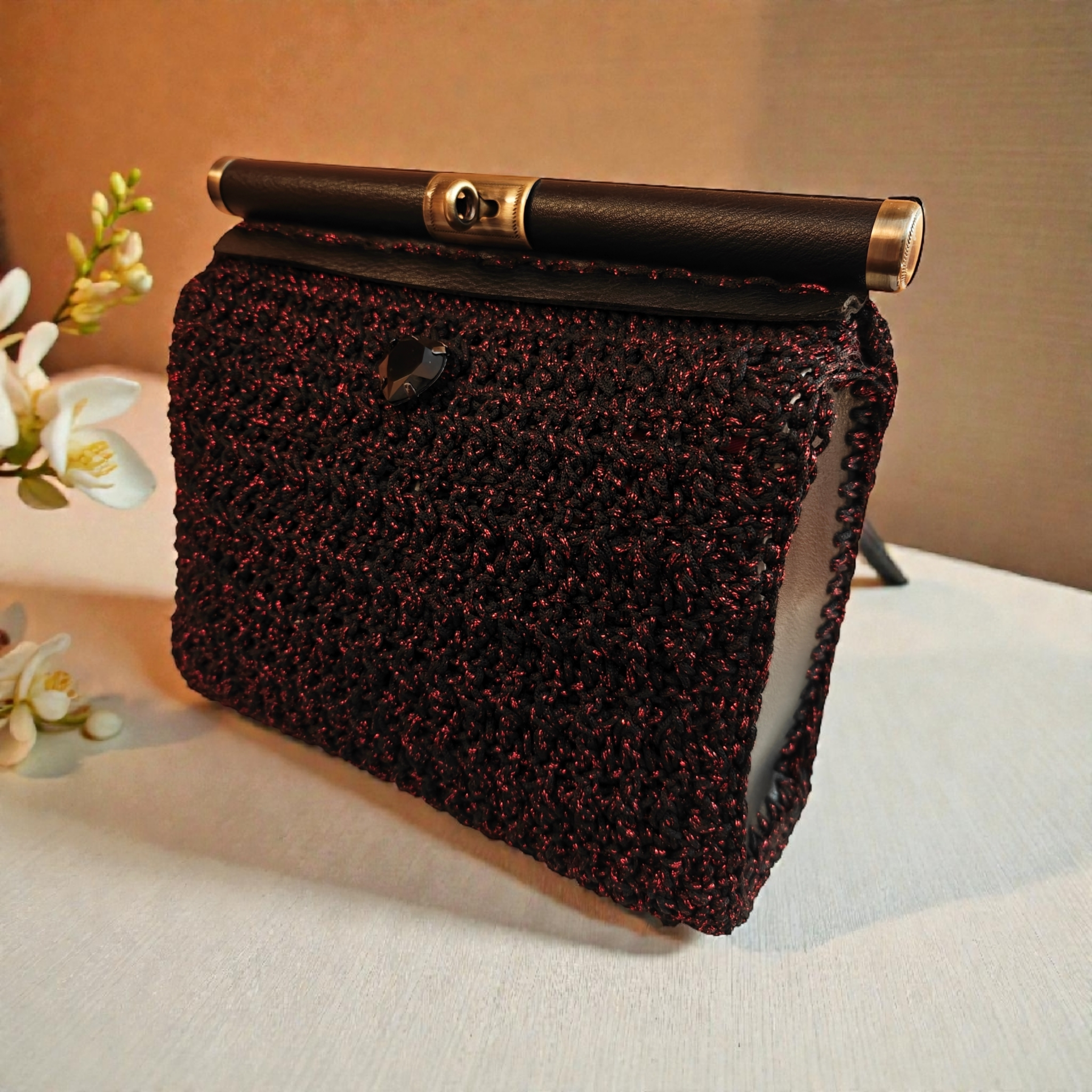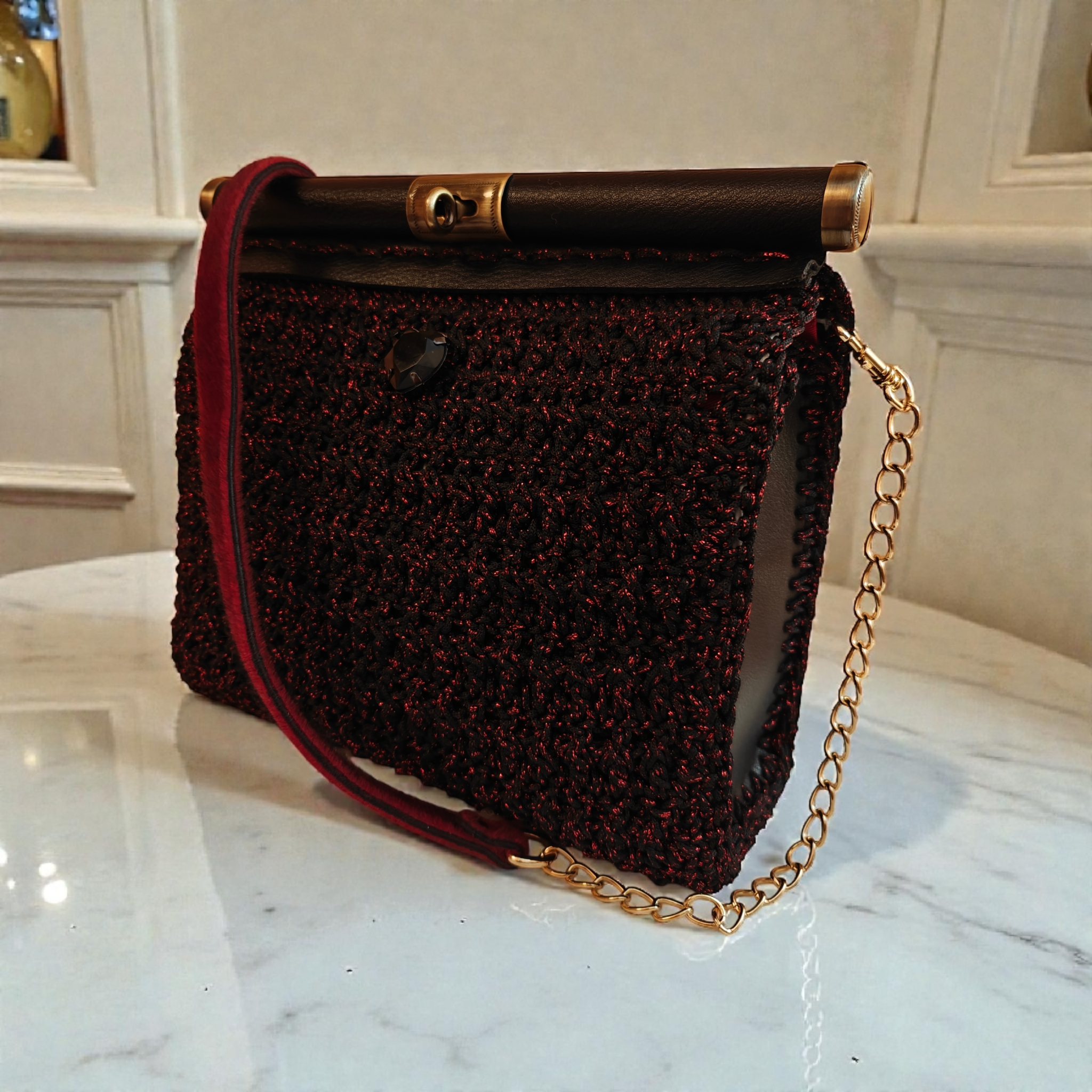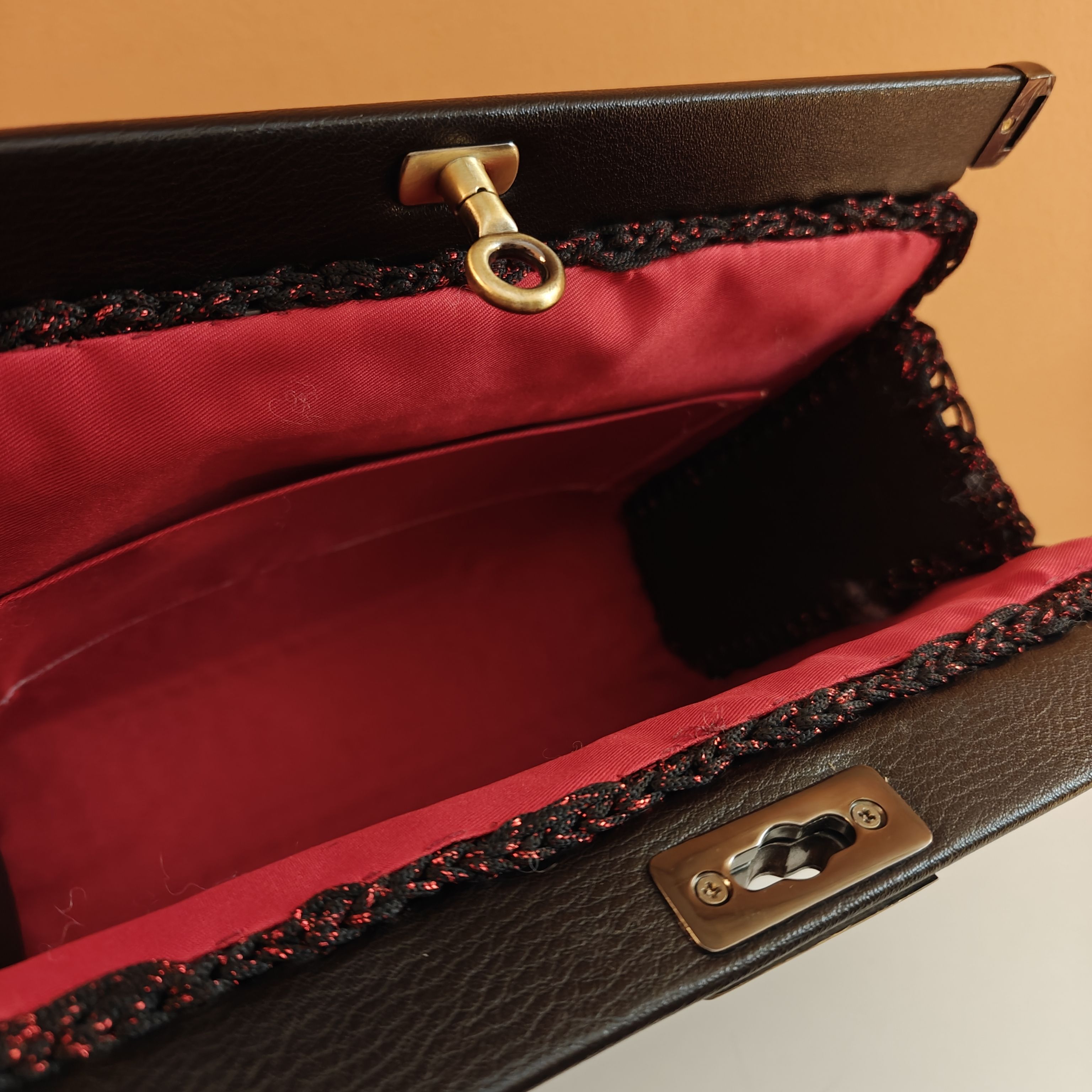 Χρώμα: μαύρο-κόκκινοΕσωτερικά : φόδρα Κλείσιμο τσάντας: δερμάτινη ράβδοςΠλαϊνά: δέρμα, μαύρο