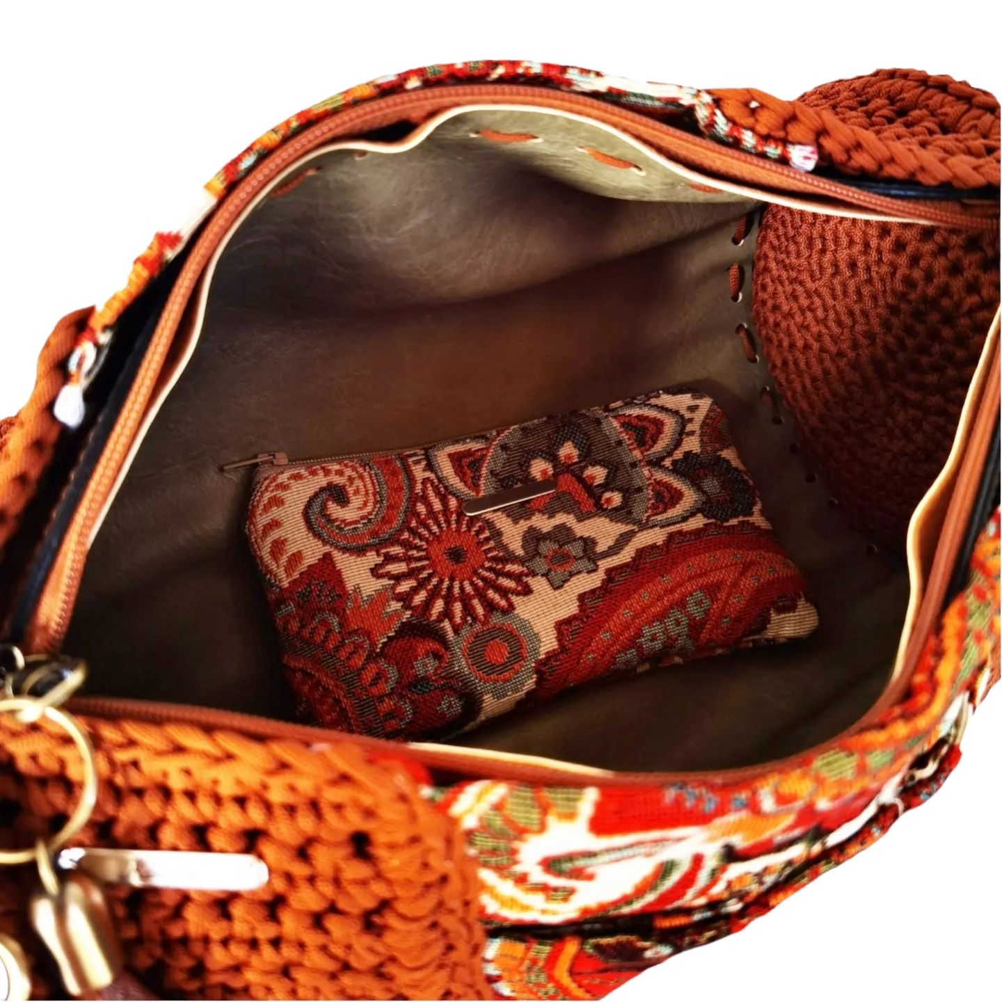 Χρώματα : μπορντώ Εσωτερική επένδυση : φόδρα με δυο τσέπες (μια για κινητό & μια με φερμουάρ) Κλείσιμο τσάντας: με φερμουάρ Λουρί : δερμάτινο χιαστί μπορντώΧρώμα αλυσίδας: νίκελΔώρο : ένα πορτοφόλι με ύφασμα λαχούρια