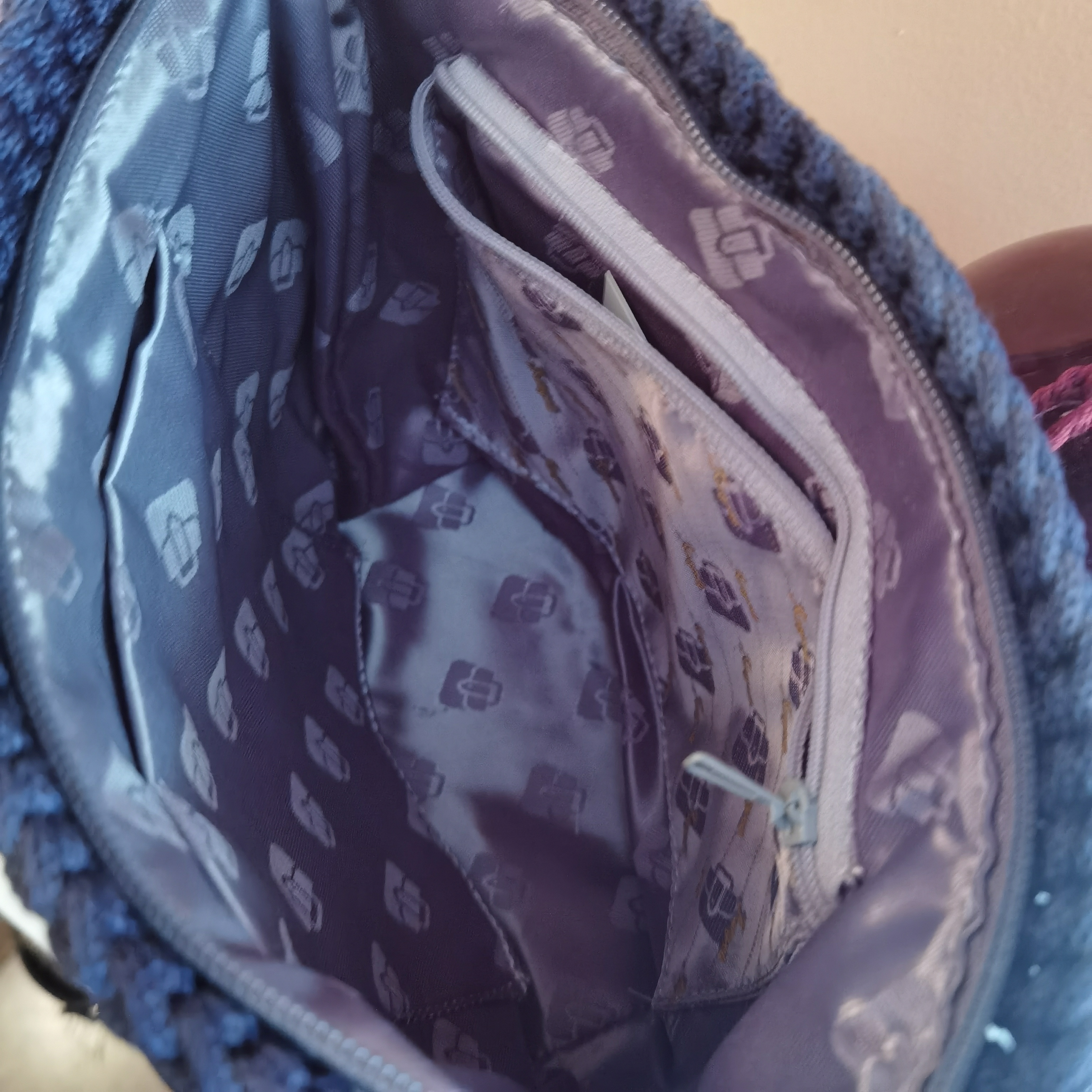 Χειροποίητο πλεκτό τσαντάκι χιαστί Χρώμα : μπλε - μπεζ - καφέ - γκρι Εσωτερικά : φόδρα με μια τσέπη Κλείσιμο : φερμουάρ & γλωσσακι μπλε Λουρί : χιαστί, μπλε δέρμα