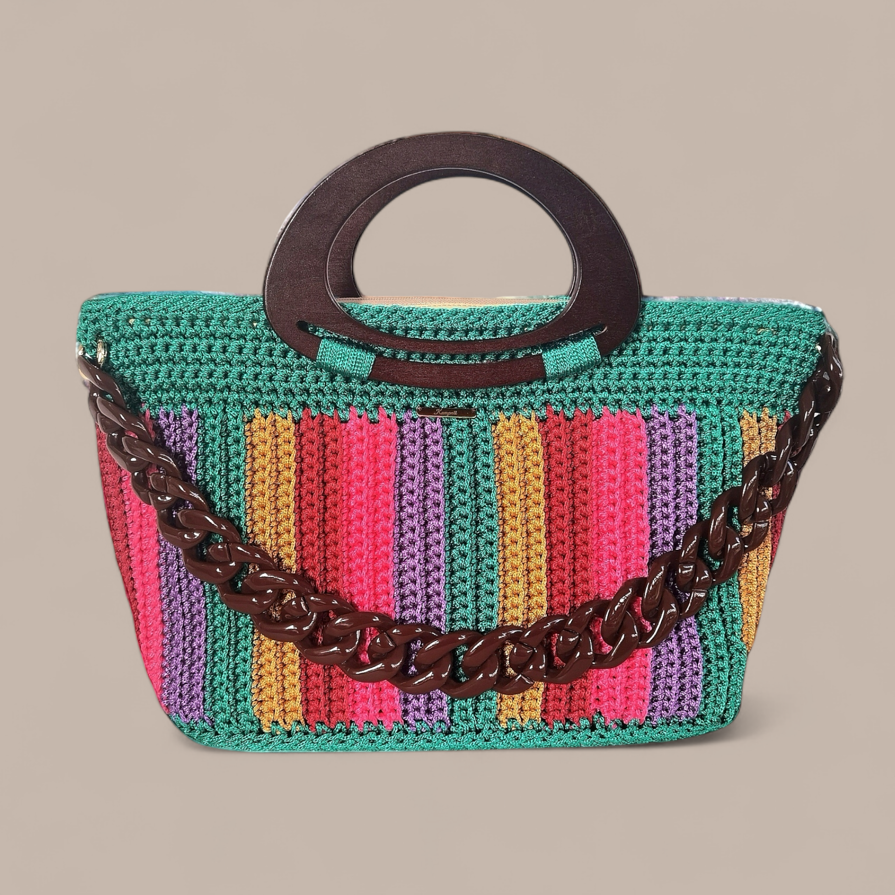 Χειροποίητη πλεκτή τσάντα Χρώματα: σμαραγδί - χρυσό - κόκκινο - φούξια - μωβΕσωτερικά : φόδρα με λεβάντεςΚλείσιμο : φερμουάρΧεράκια: ξύλινα καρπού κοκκάλινη αλυσίδα ώμου