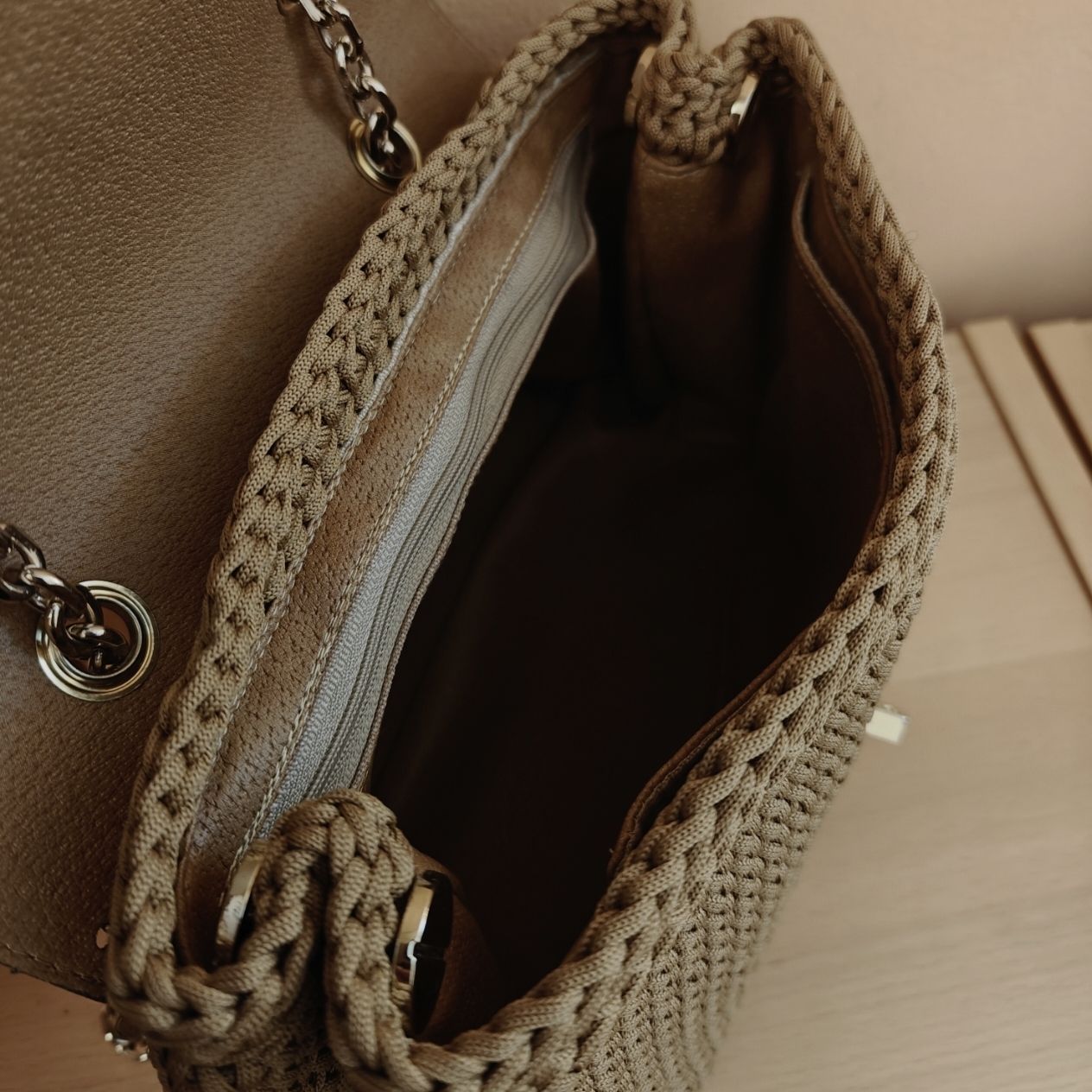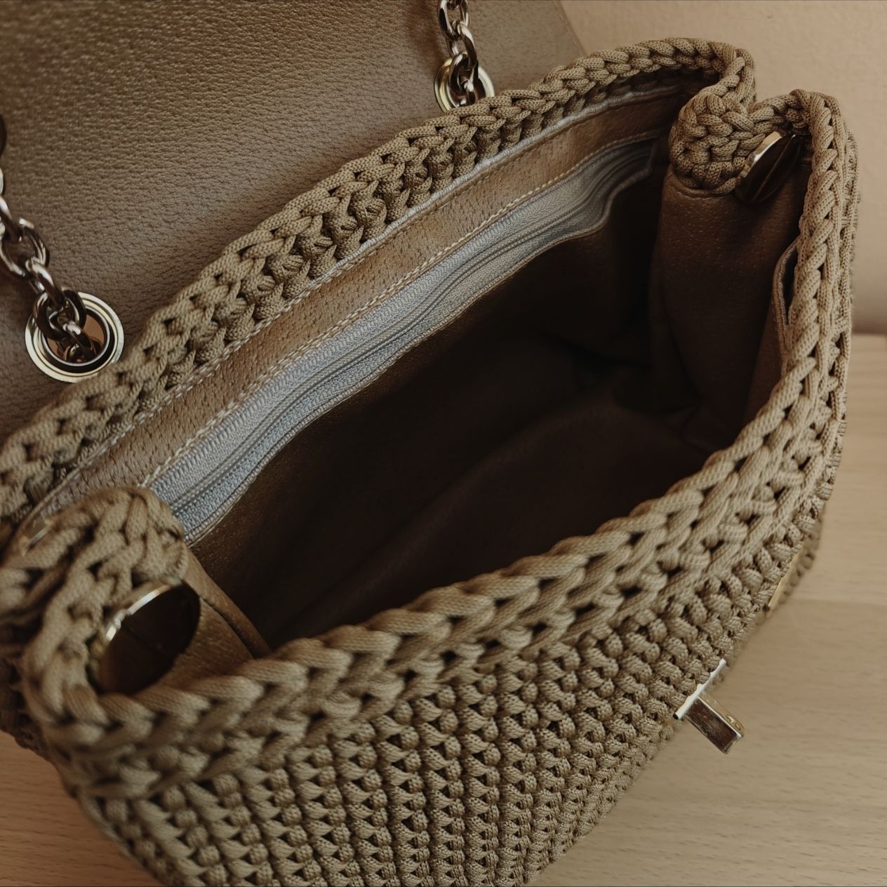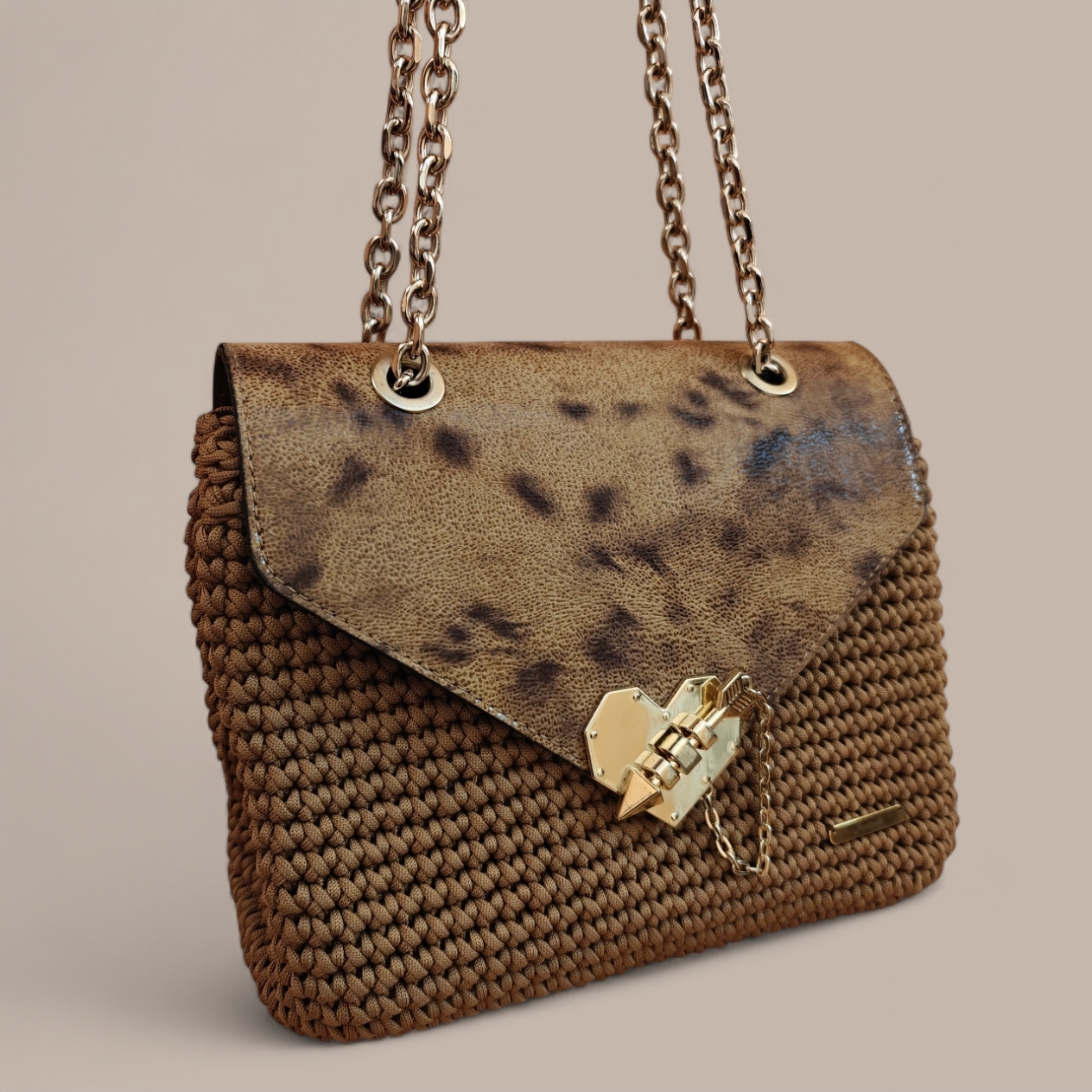 Χρώματα : μπεζ-καμελΕσωτερικά : φόδρα δερματίνης με δυο τσέπες (μια με φερμουάρ & μια χωρίς)Κλείσιμο : καπάκι με κούμπωμα καρδιά Λουράκι : αλυσίδα ώμου Διαστάσεις: 23Μ x 21Y