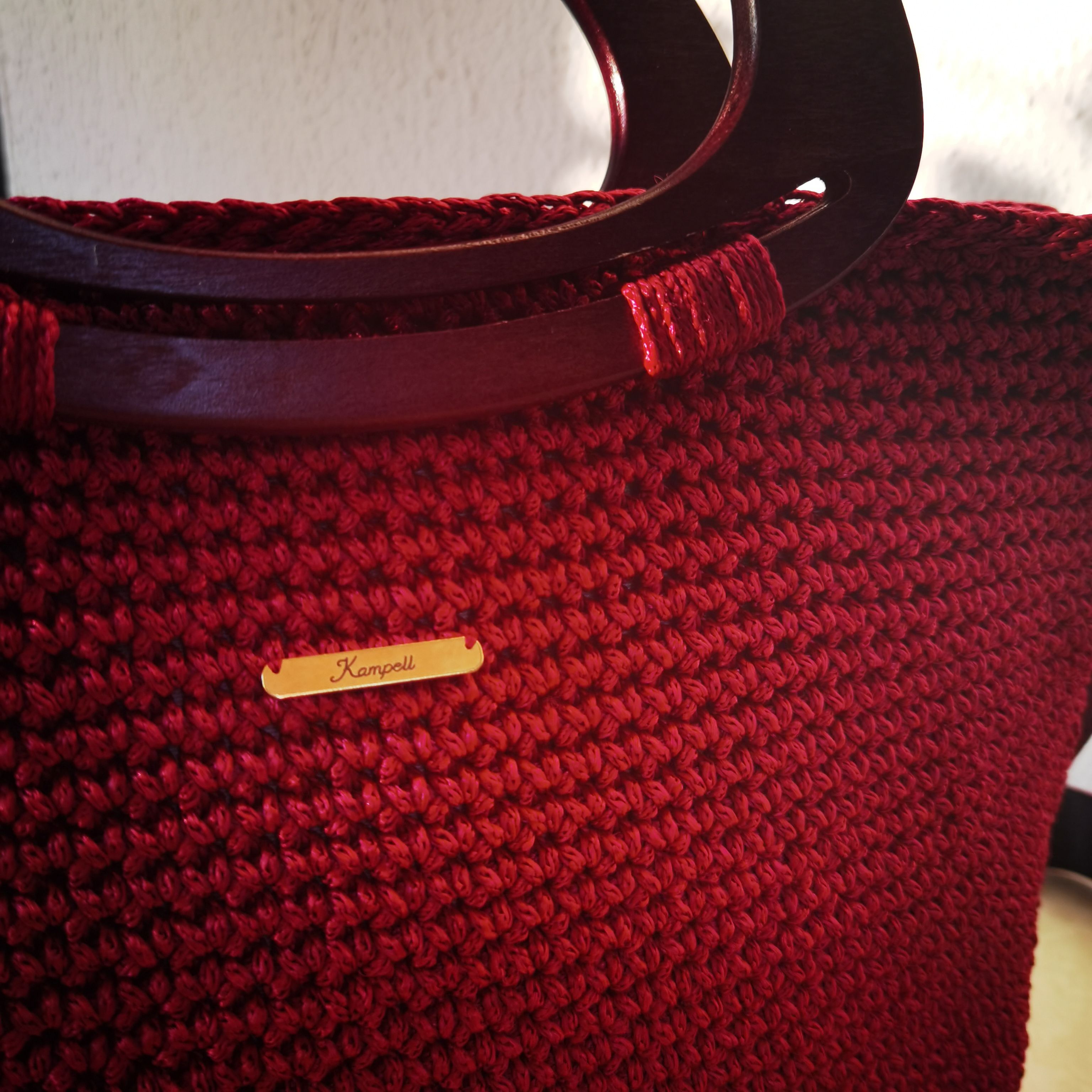 Χειροποίητη πλεκτή τσάντα μπορντώ με ξύλινα χεράκια & ιμάντα