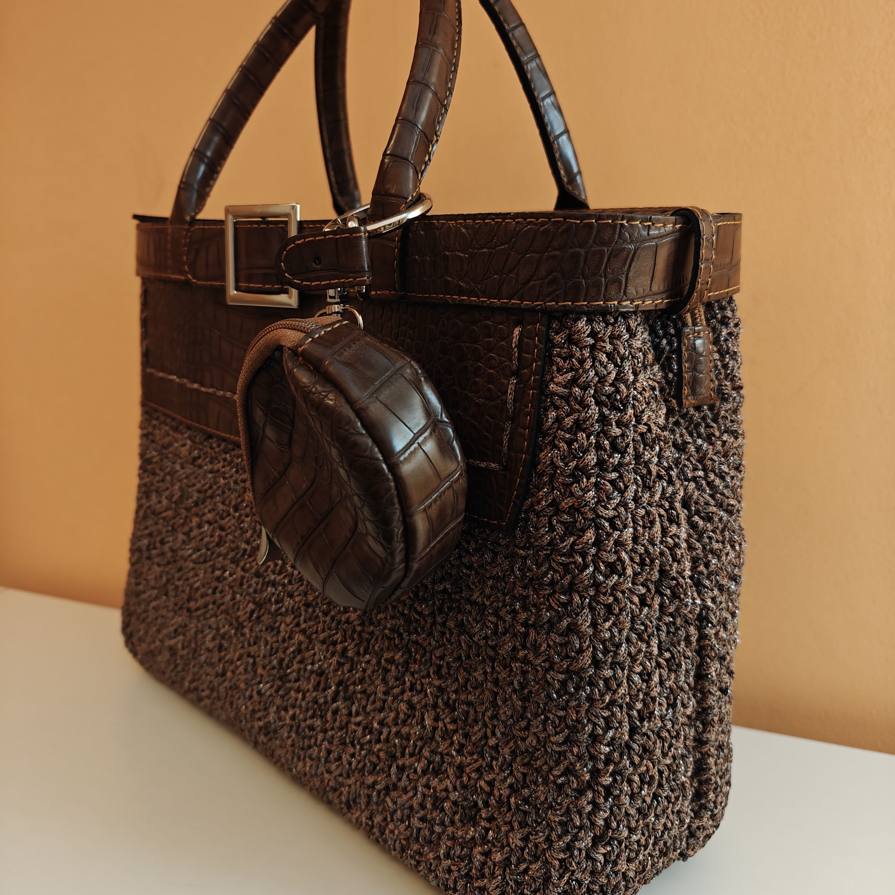 Χειροποίητη πλεκτή τσάντα καφέ μεταλλιζέ με χεράκια καρπού