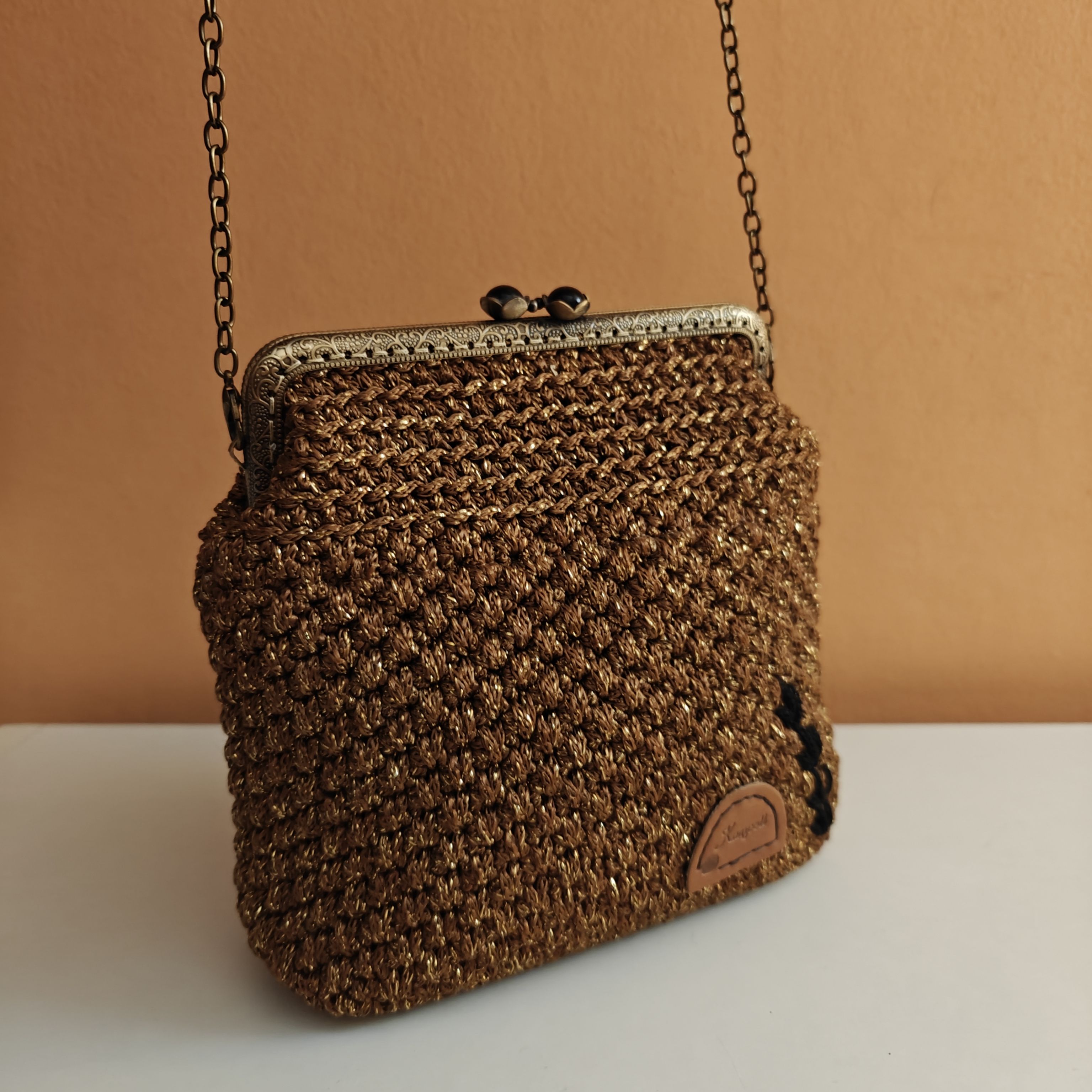 Χρώμα : καφέ Εσωτερικά : φόδρα με μια τσέπη Κλείσιμο : μεταλλικό πλαίσιο, μπρονζέ Χεράκι : αλυσίδα μπρονζέ Πάτος : ξύλινος by Qrtos Creations