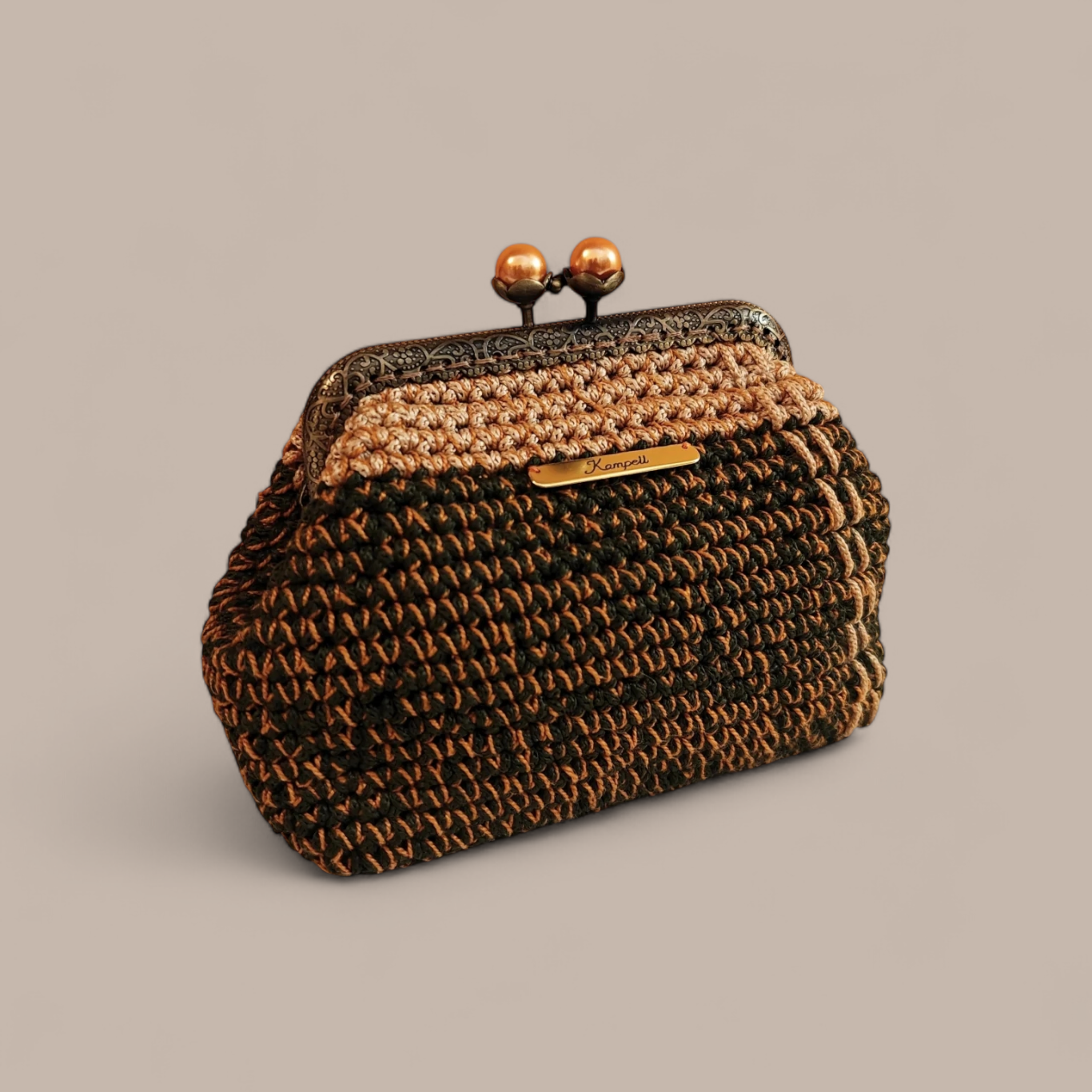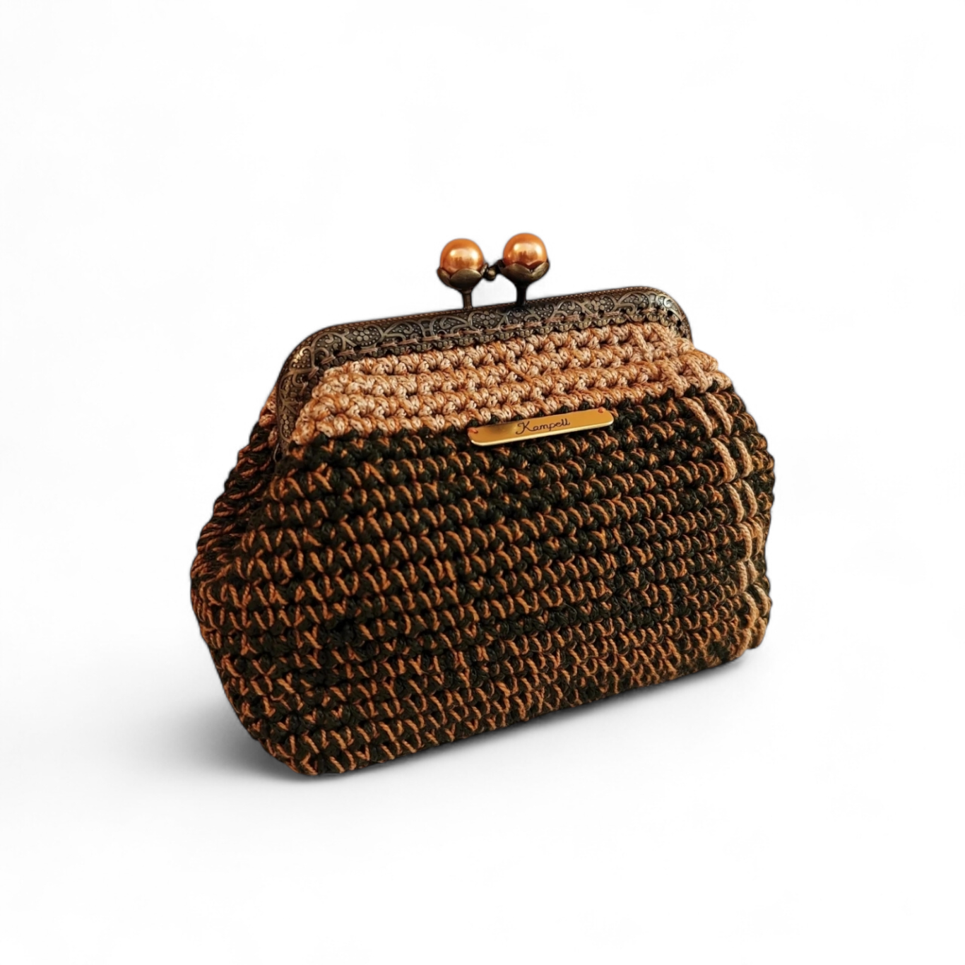 Χειροποίητο πλεκτό πορτοφολάκι με μεταλλικό πλαίσιο Εσωτερικά : φόδρα Κούμπωμα : κλικ κλακ (μπρονζέ) με σομόν περλες Πάτος : ξύλινος by Qrtos Creations