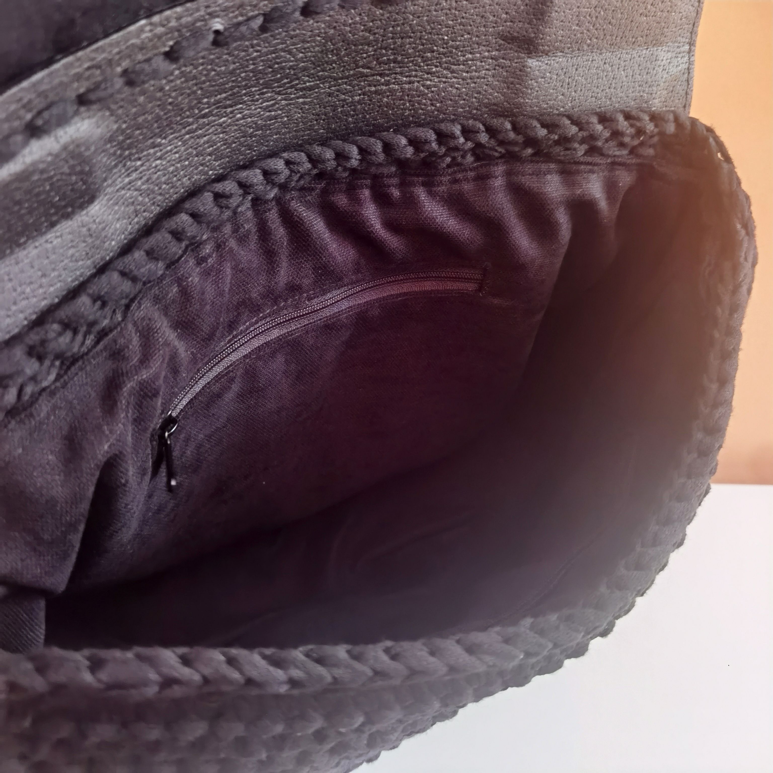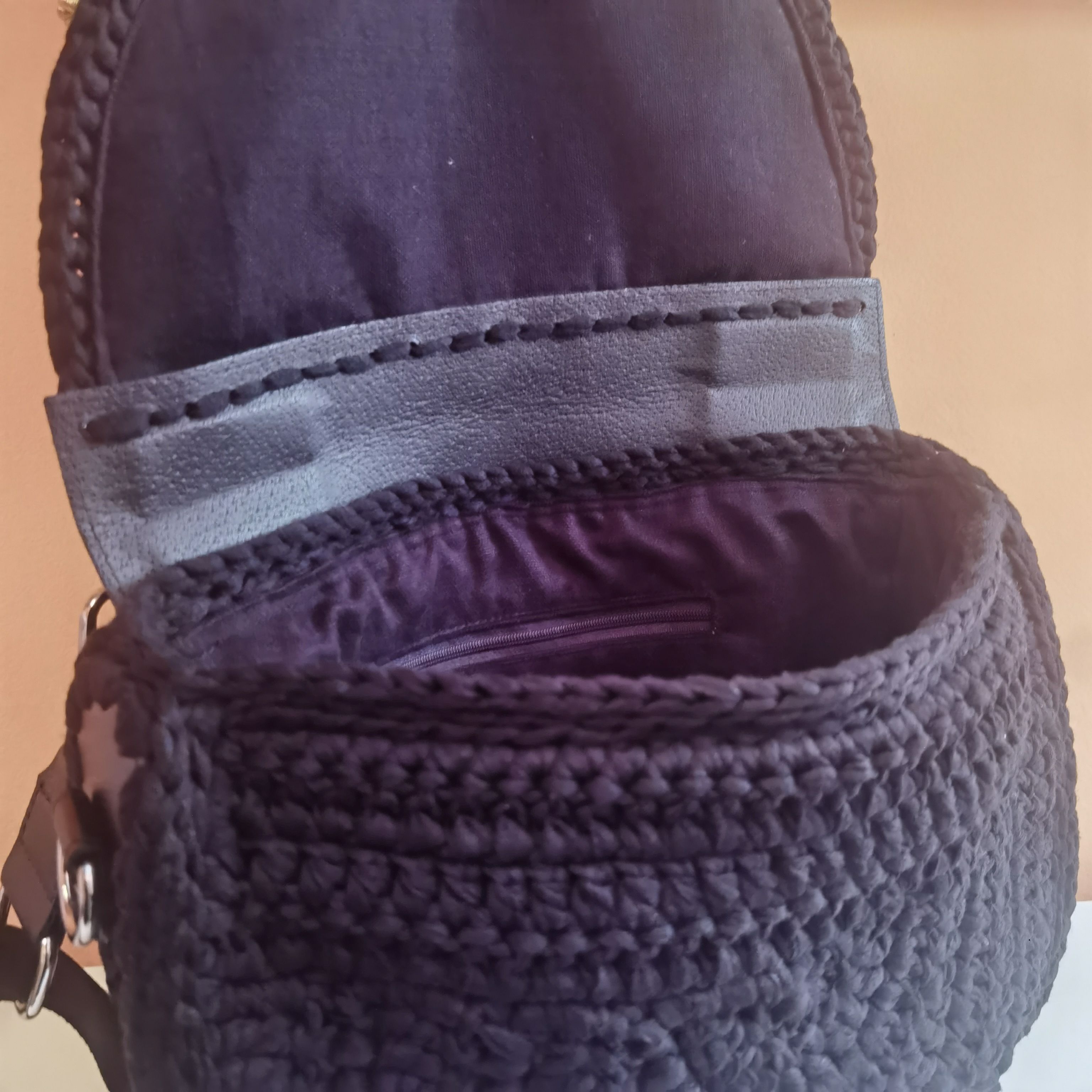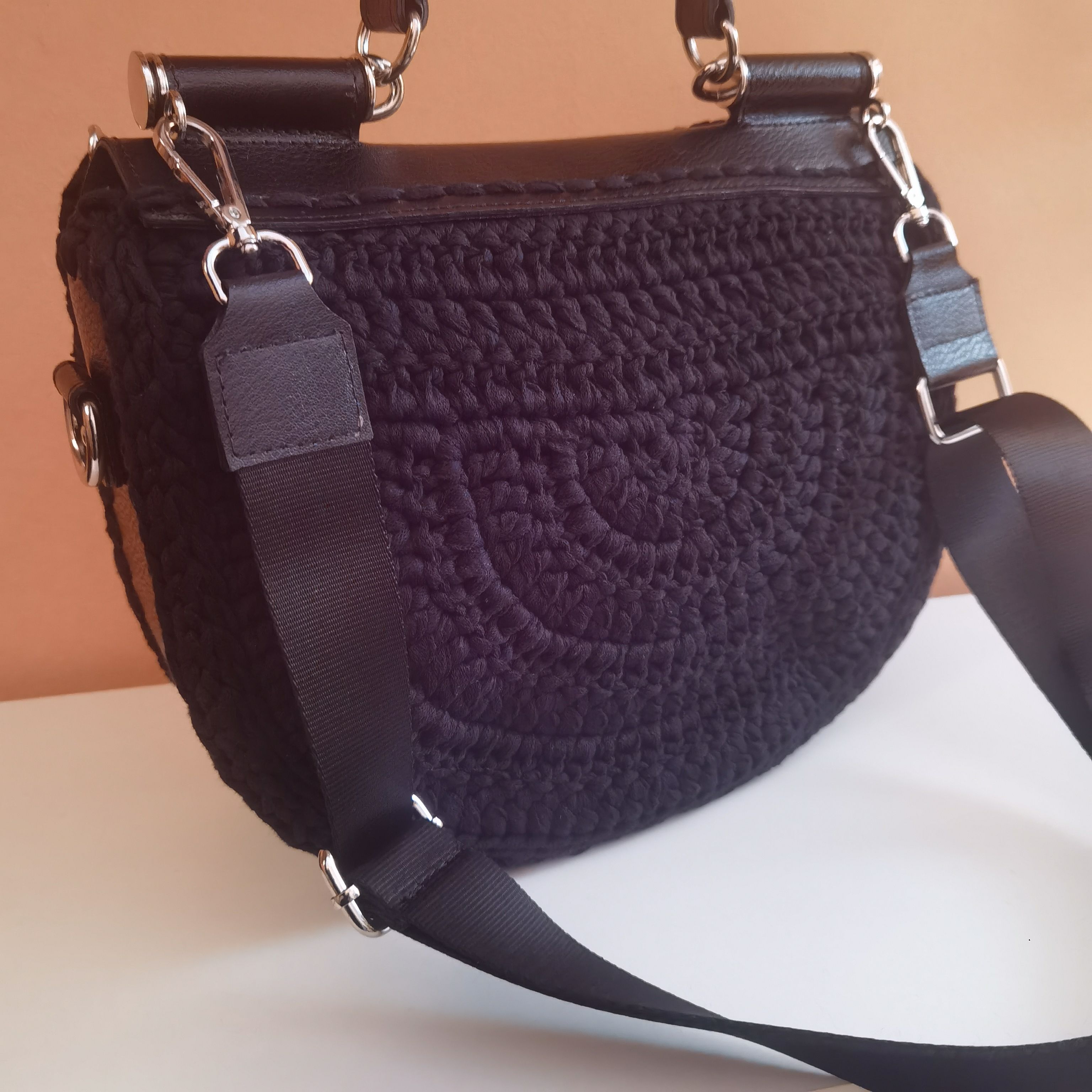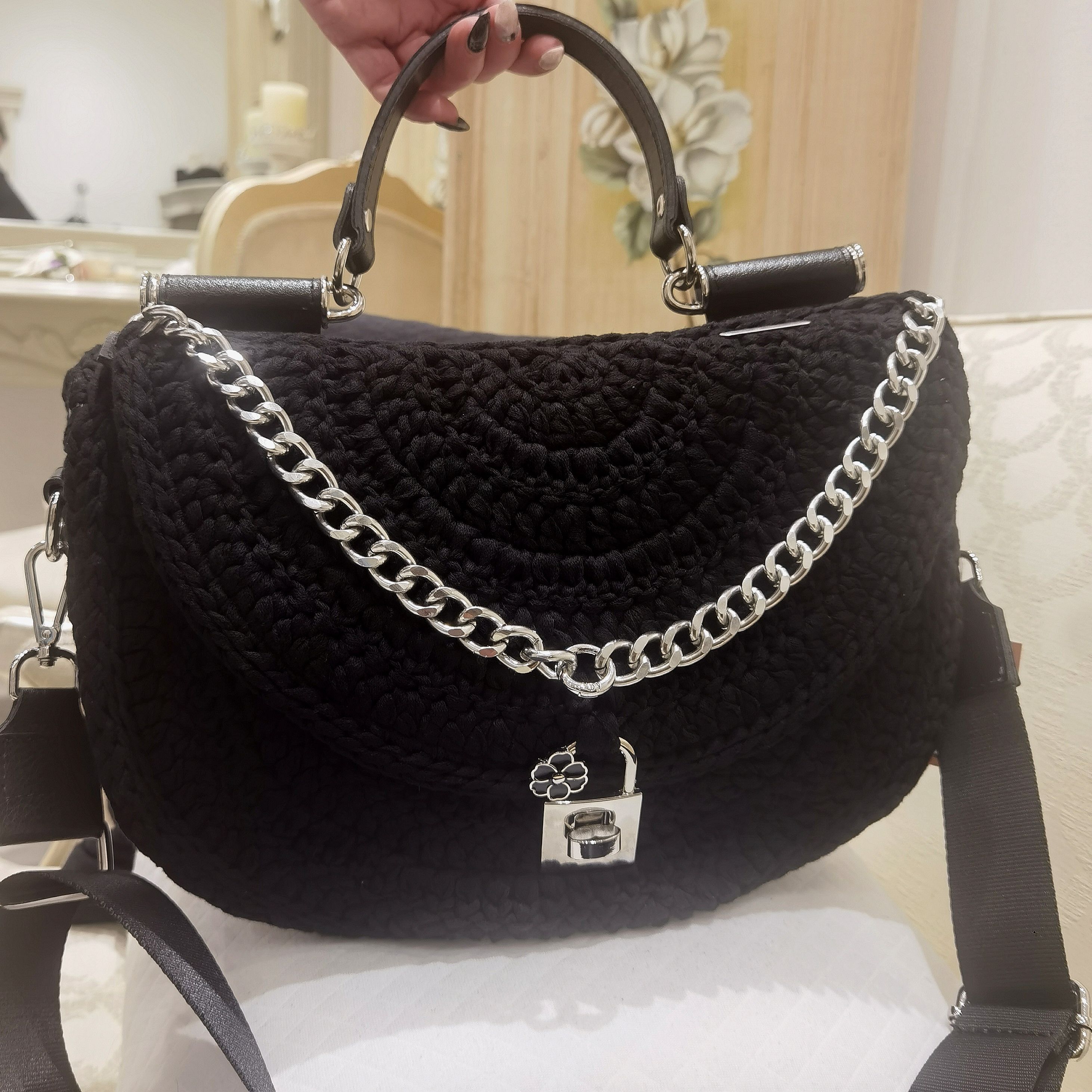 Χρώμα : μαύρο Καπάκι: πλεκτό, μαύρο Εσωτερικά : φόδρα σουέτ, μαύρο Κλείσιμο : δερμάτινο eco χεράκι, μαύρο Πάτος: περιμετρικός, δέρμα eco μαύρο Χεράκι: ρυθμιζόμενος ιμάντας, μαύρος Διακοσμητική αλυσίδα